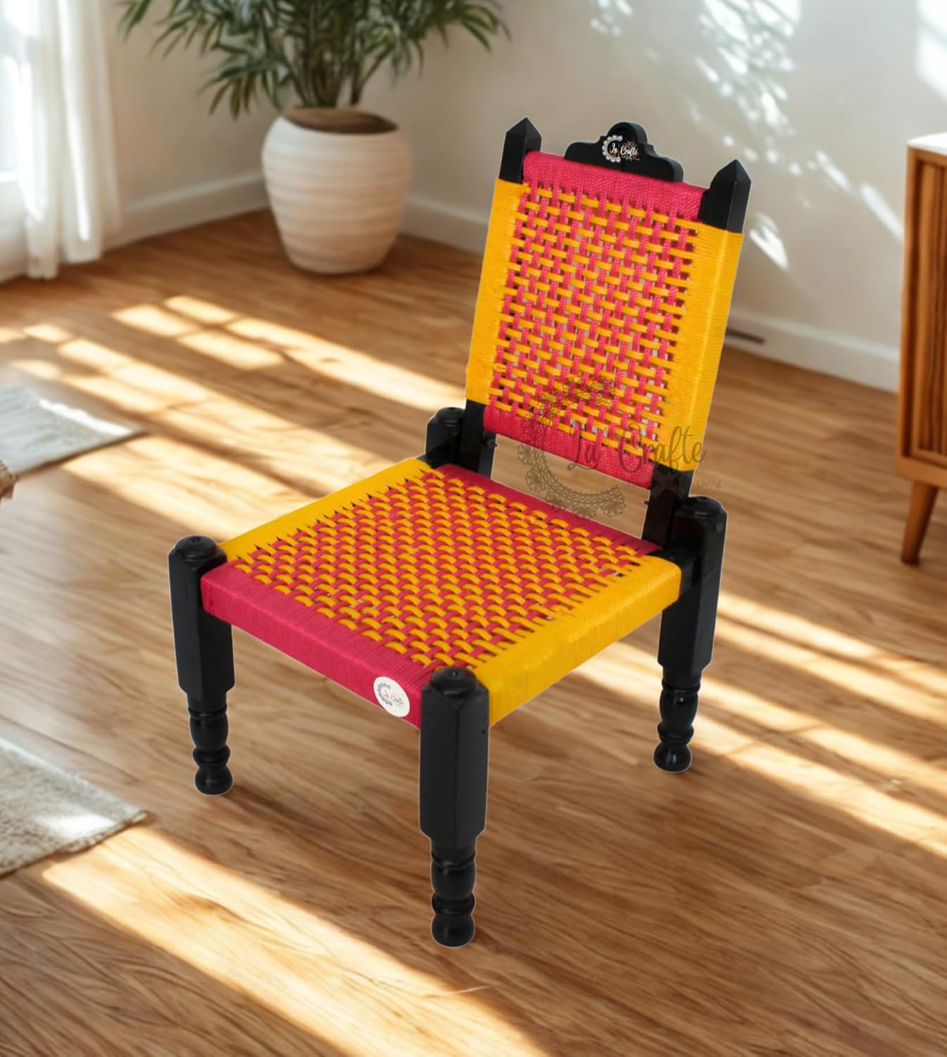 Introducing La Crafte’s exquisite foldable wooden chair, a perfect blend of traditional Rajwadi craftsmanship and modern convenience. The chair features a striking multicolour Resham rope weaving pattern in vibrant turquoise, pink, purple, and yellow hues, creating an eye-catching geometric design that adds a splash of colour to any space. The handcrafted wooden frame in elegant black finish provides sturdy support while maintaining a classic aesthetic. What sets this chair apart is its innovative foldable design – it can be easily collapsed for compact storage or transportation, making it ideal for various occasions from traditional ceremonies to casual balcony seating. The wider seating space ensures comfortable seating, while the traditional Khatli (Mudda) style brings authentic charm to your living space. Note that the Resham rope colours may vary slightly due to the natural hand-dyeing process. This versatile piece works beautifully as a statement chair for your home, a practical seating solution for ceremonies like haldi rasam,mehandi rasam or a charming addition to your balcony decor.