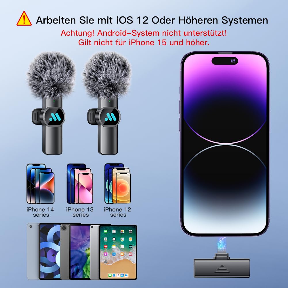 Product compatibility: The wireless lavalier mini microphone is only compatible with iPhone and the system must have at least version 12 of iOS. If one of the lavalier microphone wireless no longer has power, you can replace it with another microphone wireless without electricity during charging. This product is not compatible with USB-C for iPhone 15 and above. 🚫
