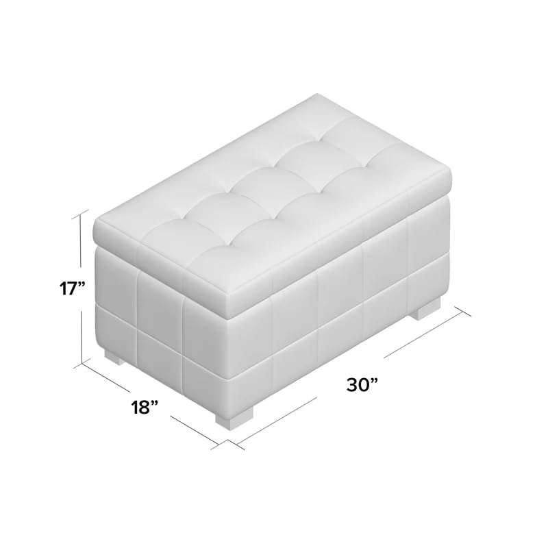 Sleek Design: The Maiden Ottoman Bench features a contemporary design with clean lines and a sophisticated faux leather finish, adding a touch of elegance to your space.Versatile Use: Perfect for use as a footrest, extra seating, or even as a chic storage solution. Its compact size makes it ideal for small spaces while still providing ample functionality.Storage Space: Lift the top to reveal hidden storage, ideal for keeping blankets, magazines, or other essentials neatly tucked away.Comfortable Seating: The cushioned top offers a comfortable seating experience, whether you’re putting on shoes or simply enjoying a moment of relaxation.Durable Construction: Made with high-quality materials, this ottoman is built to last, ensuring long-term use and enduring style.Dimensions: 17” H x 30” W x 18” D. Its well-proportioned size makes it a perfect fit for end-of-bed use, living rooms, or hallways.Color Options: Available in a range of elegant colors to suit your decor needs.