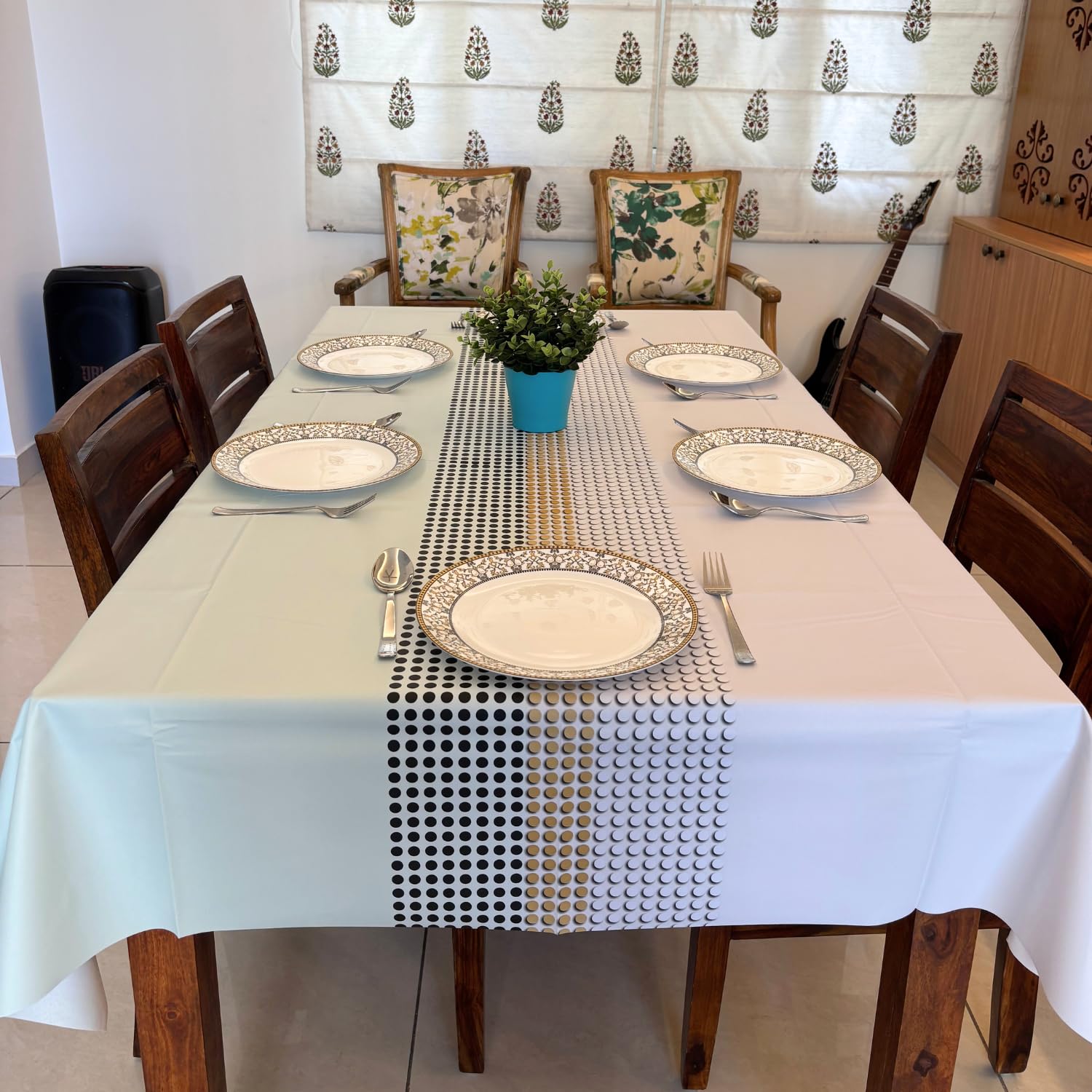 DIMENSIONS: Premium table cover measuring 140 cm x 200 cm (55 by 78 inch), perfect for 6-seater dining tables with ample coverage and elegant draping. Please check your dining table size before ordering as even 6 seater table comes in various sizes.