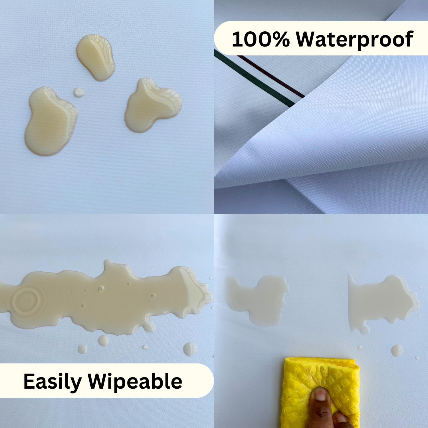 MATERIAL: High Quality 100% Polyvinyl material that is waterproof, spillproof and protects your table while being easy to clean with a damp cloth/sponge wipe. Our Vinyl material is such that its soft texture gives a good feel and not plasticky, which enhances the overall experience.
