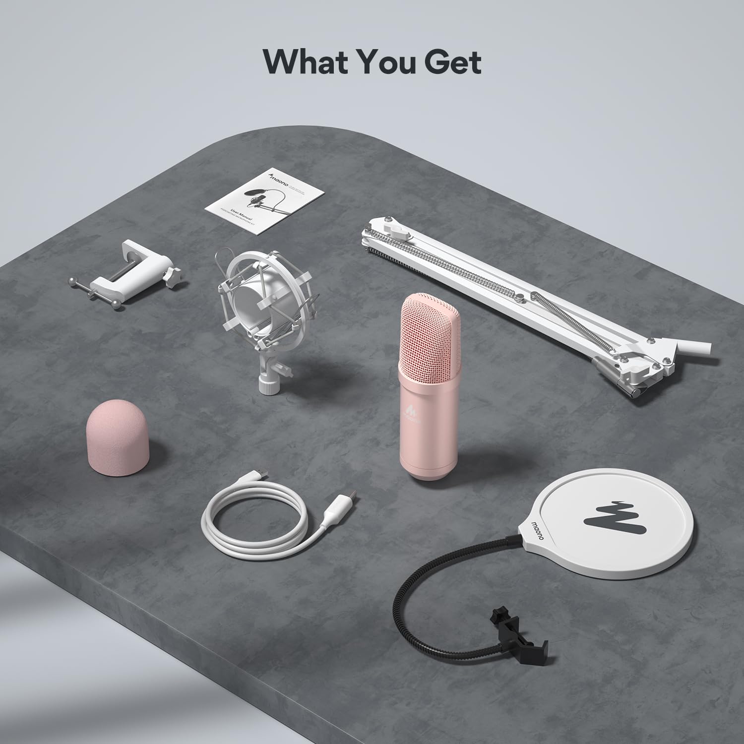 Packing list: Condenser mic, adjustable scissor arm stand, metal shock mount, pop filter, foam mic windscreen, table mounting clamp and USB-B to USB-A cable