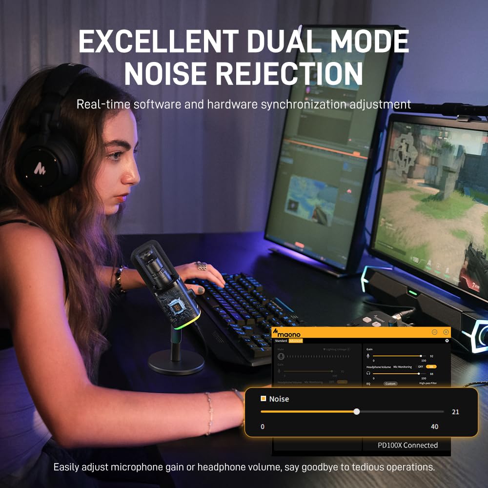Improve 50% Sound Details: Compared to microphones with a 16-bit/48kHz sampling rate, MAONO PD100X gaming mic adopts a wide frequency response of 40Hz-16KHz and a high sampling rate 24-bit/48kHz, captures more sound details and conveys richer, clearer audio, suit for gaming and recording in all audio applications. Even in noisy rooms, PD100X’s customized cardioid capsule accurately captures clear audio with excellent ambient noise rejection so that you can immerse yourself in gameplay or streams