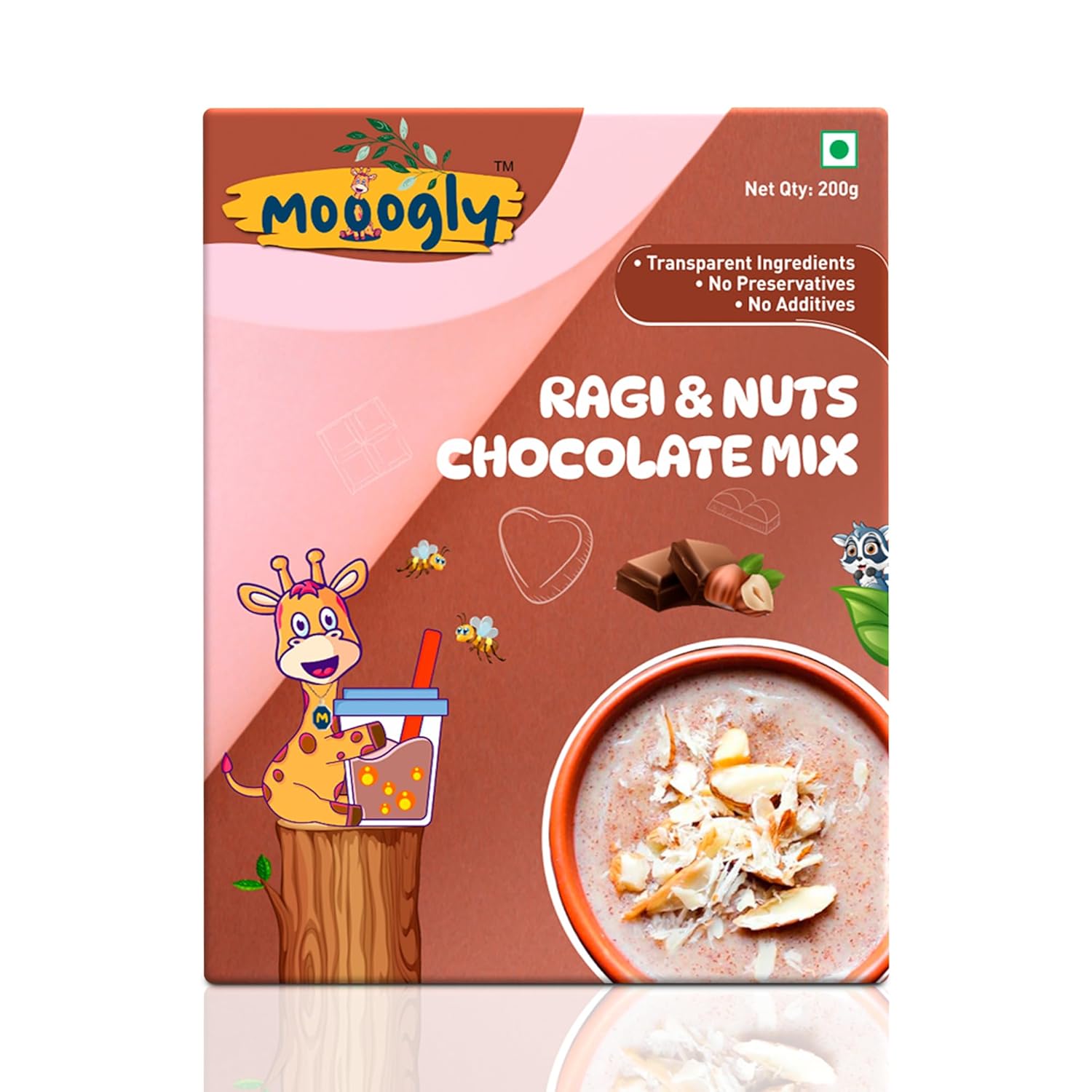 Mooogly Ragi & Nuts Chocolate Mix | 200g – Premium Ragi Hot Chocolate Mix | Vegan, Gluten-Free, Unsweetened & No Refined Sugar | Instant Hot Ragi & Nuts cocoa Powder for Kids & Adults.