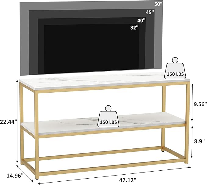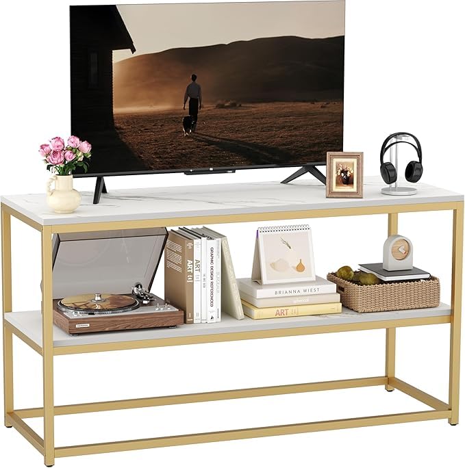 【Modern TV Stand】Constructed of gold metal frame and faux marble textured finished, 2 tier delicate shelves, the sleek glam look brings a charming complement to your home, without sacrificing functionality and practicality simultaneously.
