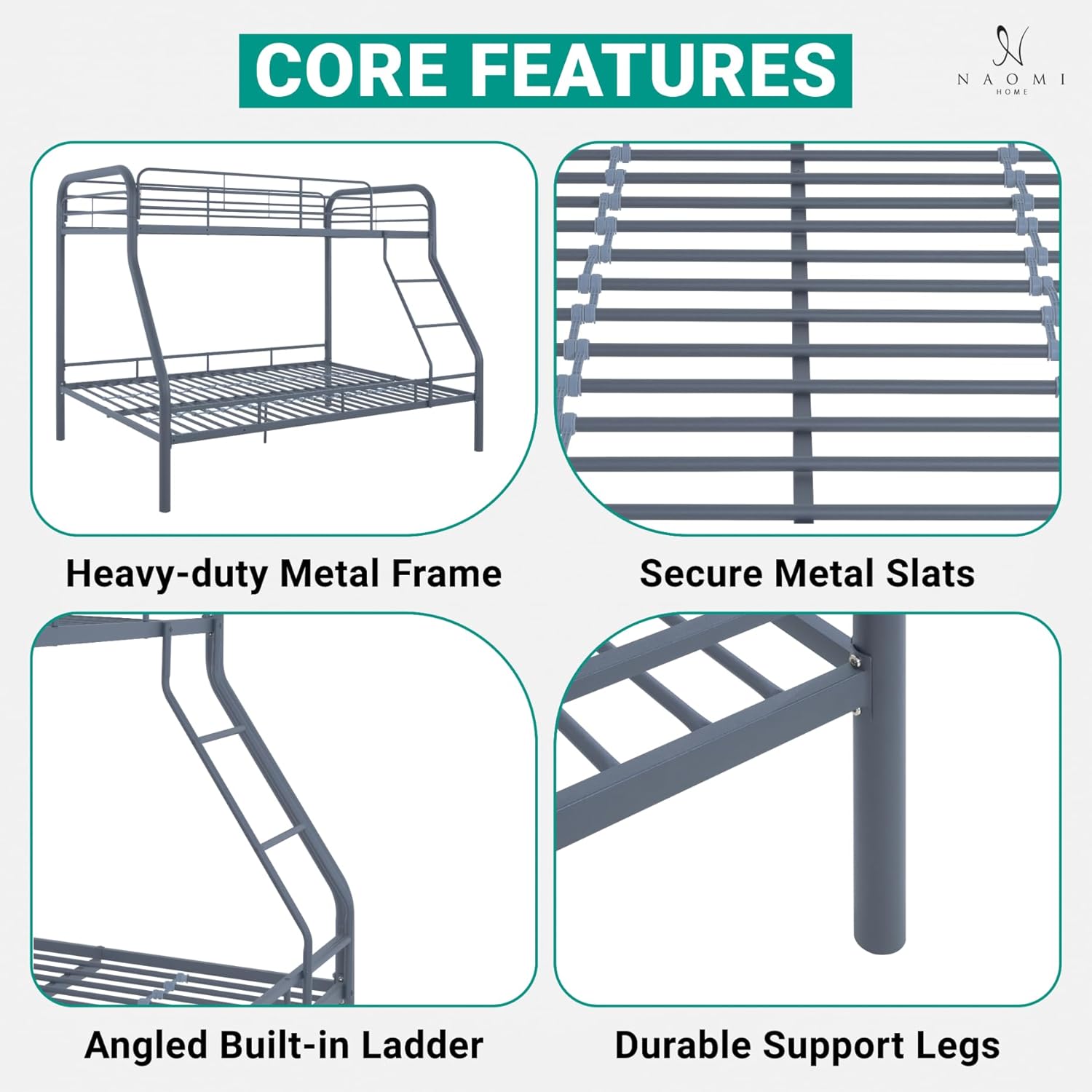 Naomi Home Hollywood Bunk Beds Twin Over Full Size Heavy Duty Metal Bunk Bed with Safety Guardrails Angled Ladder Underbed Storage 800LBs Capacity – for Kids and Teens Twin Over Full Bed Gray