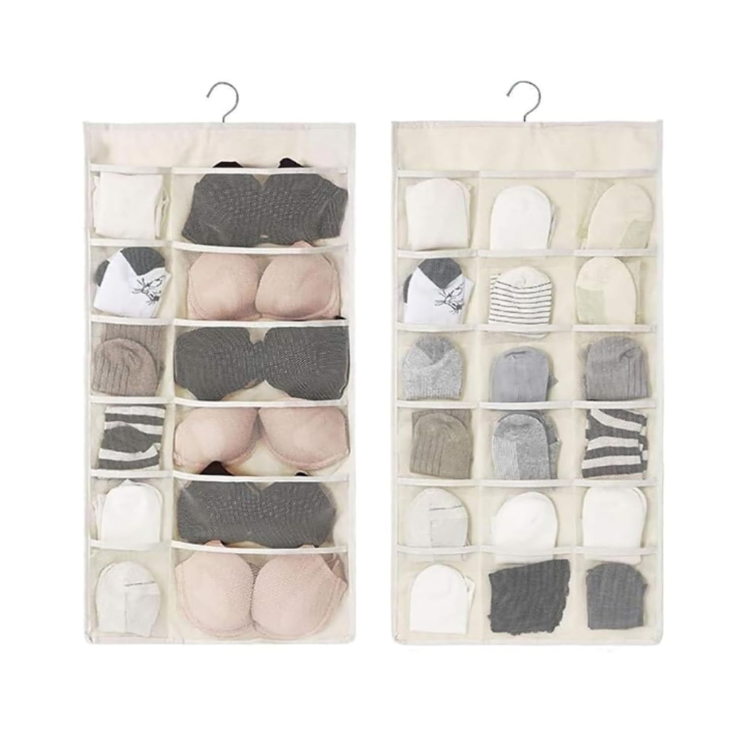 Design & Capacity: 30 Pockets Storage – Features 30 spacious pockets (15 on each side) for organizing small items. Double-Sided Organizer – Maximizes storage while taking up minimal space. Transparent Pockets – Clear plastic pockets allow for easy identification of stored items. Versatile Storage – Perfect for organizing socks, bras, underwear, ties, scarves, baby clothes, accessories, and more.