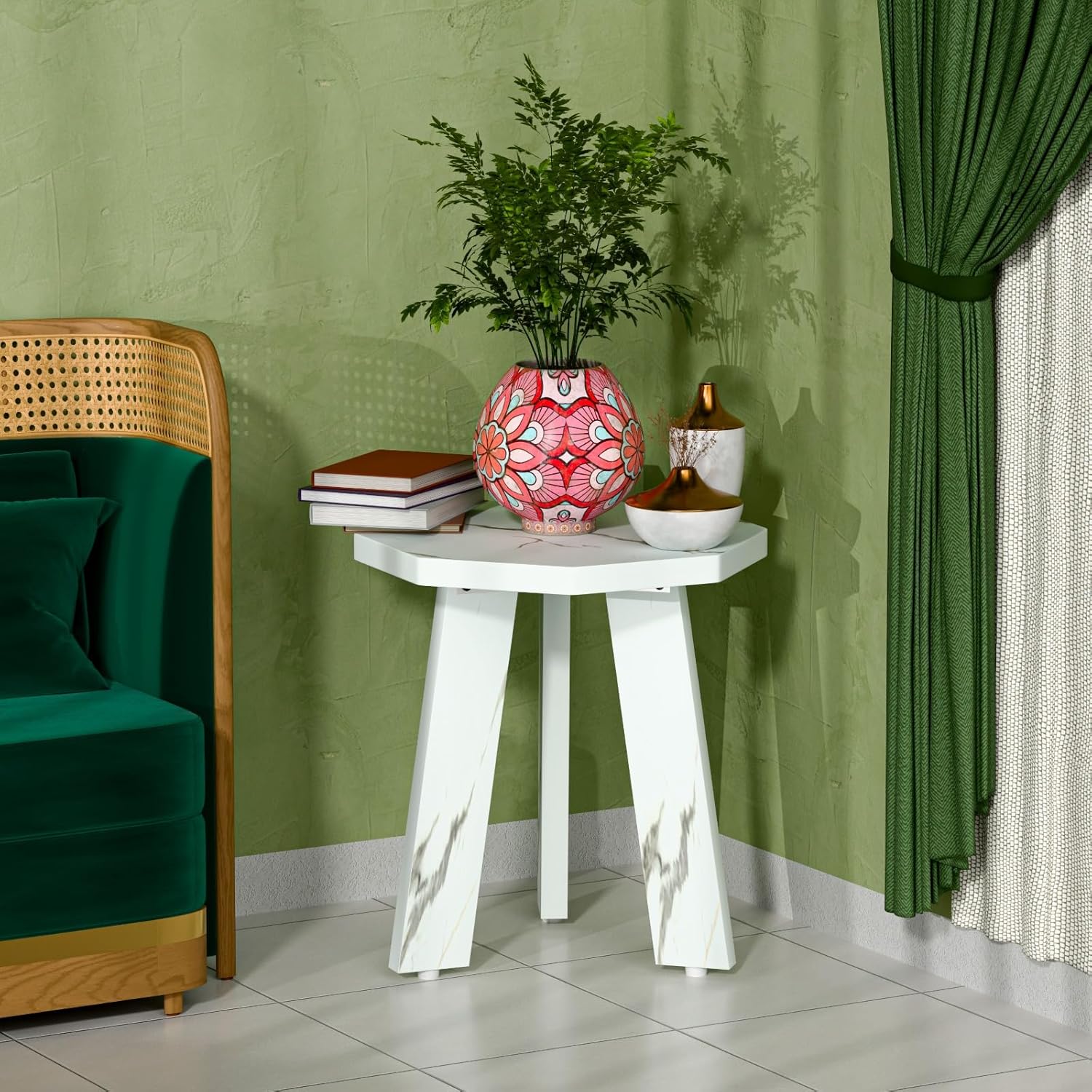 Upgrade your décor with this modern hexagonal faux marble end table, combining contemporary style with practical functionality. The crisp white tabletop with elegant marble-inspired veining delivers a sophisticated look, while the three sturdy legs ensure stability for everyday use. Its compact footprint makes it perfect for small spaces, whether you place it next to your sofa, armchair, or bed. Simple to assemble and built to last, this end table is a versatile addition to any living room, bedroom, or office.