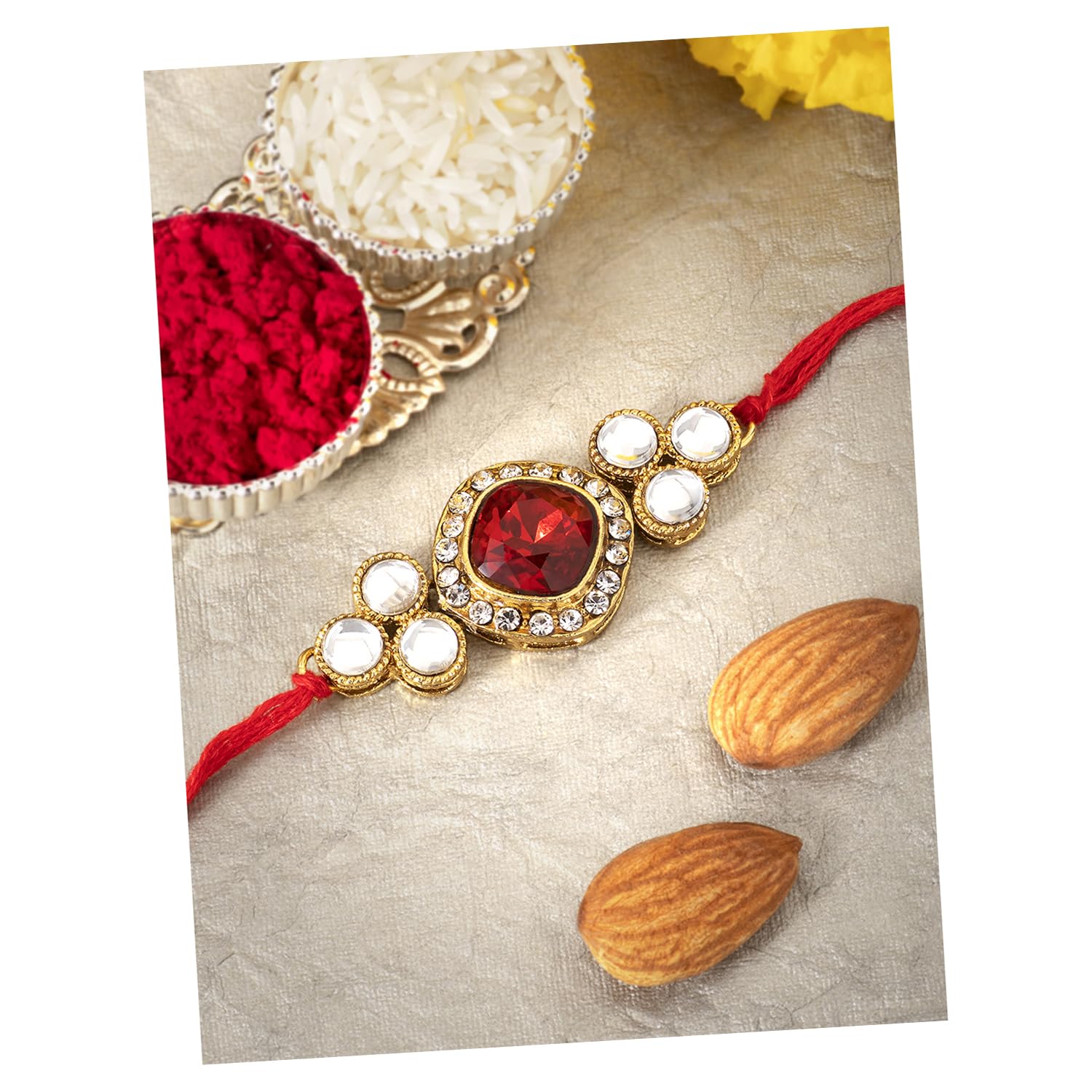 Peora Rakhshabandhan Thread Rakhi for Brother Bhaiya | Kundan Crystals & Pearl Studded | Rakhi Hamper Roli Chawal & Greeting Card