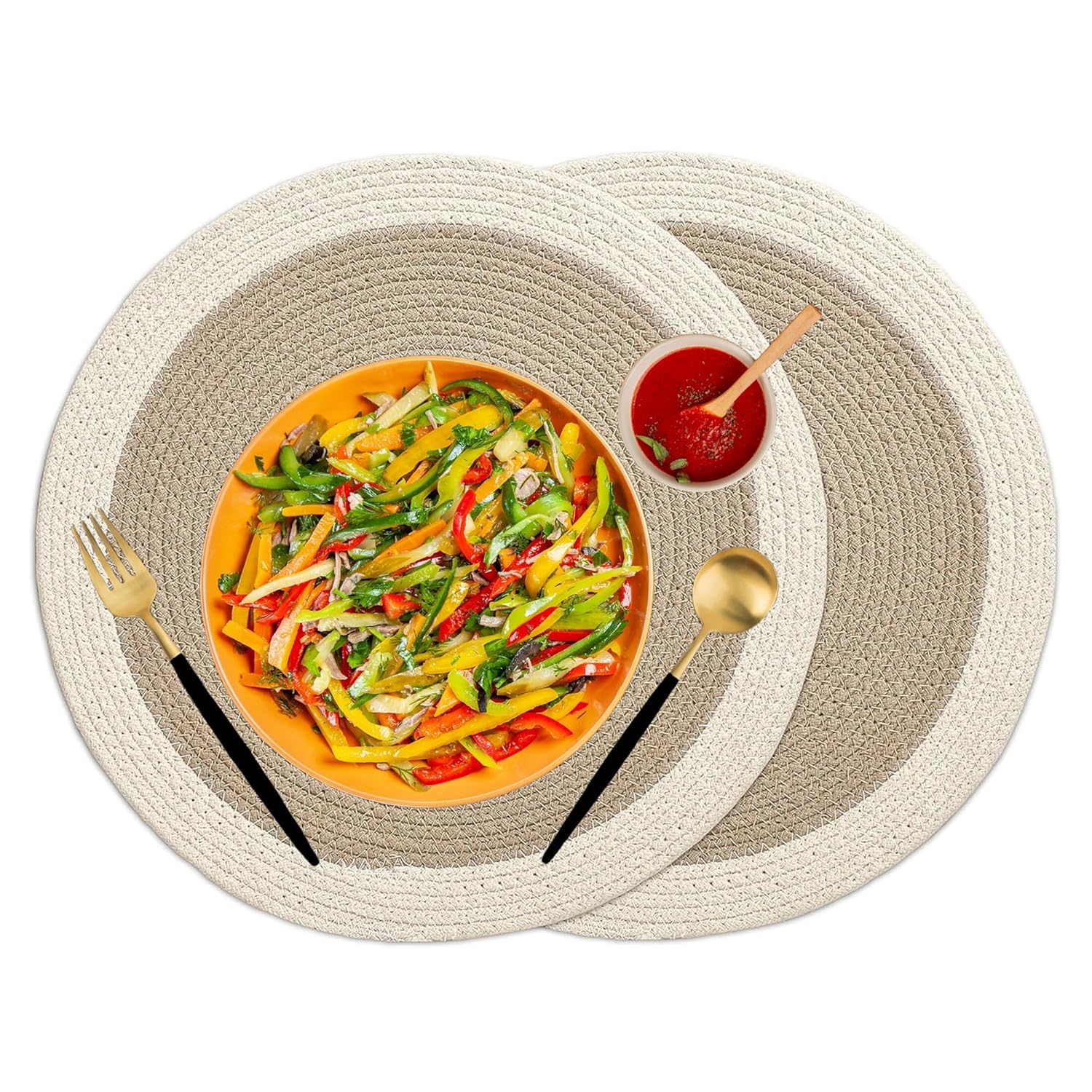 ◆ Premium Cotton Rope Craftsmanship: These placemats for dining table set of 6 are handcrafted from 100% natural cotton rope, offering a durable, heat-resistant surface. Use them as food mat for bed, dining table accessories, or mats for dining table.