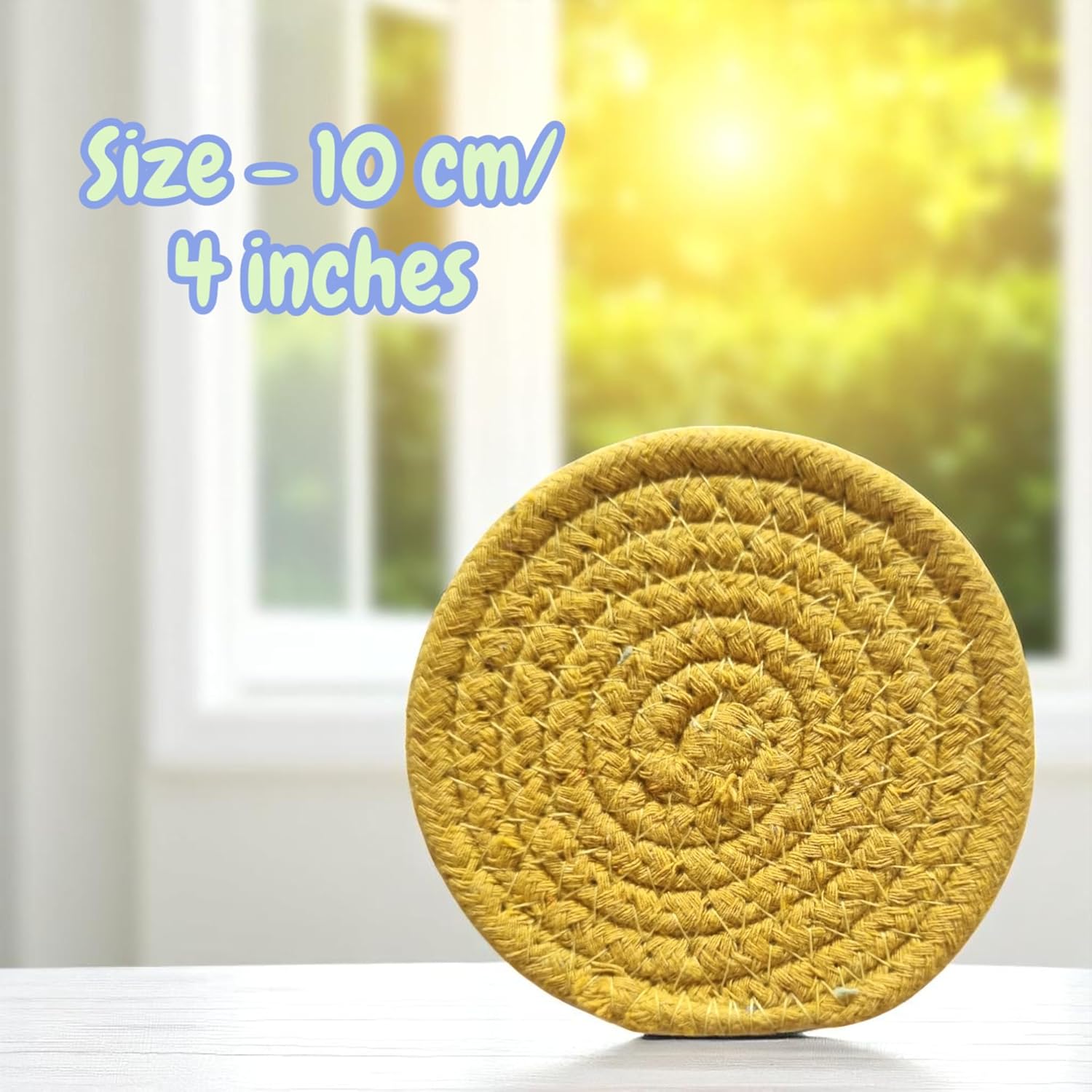 ✅ Premium Cotton Coasters (Set of 6) – Round 10 cm absorbent cotton fabric coasters in bright yellow, perfect for aesthetic dining table, kitchen, centre table & coffee table.