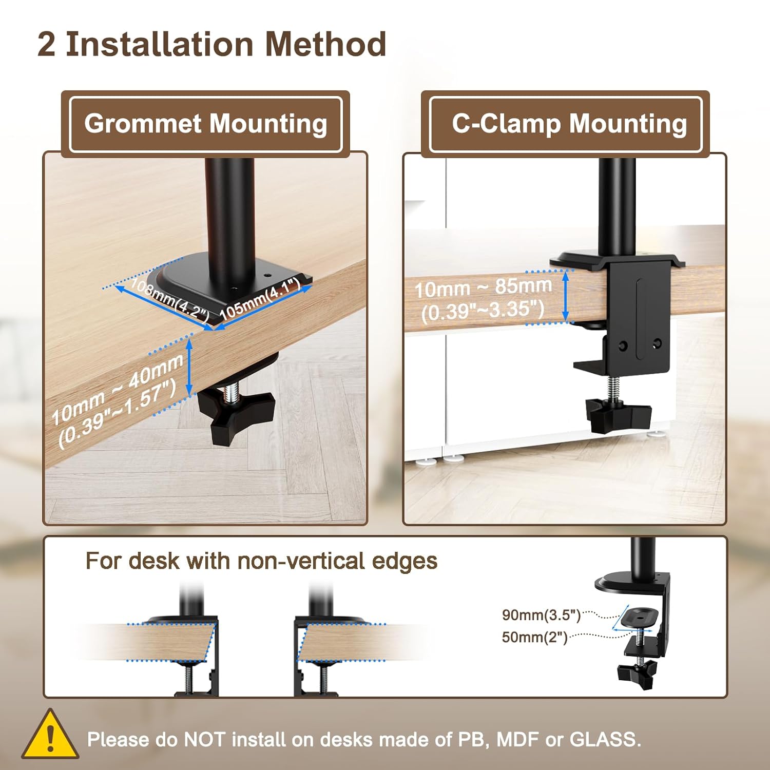 2 mounting options: the triple screen mount comes with a C clamp and a grommet mounting kit. You can attach the monitor stand and hold your three monitors with the C clamp. If there is a hole in your table, you can choose the nozzle assembly.