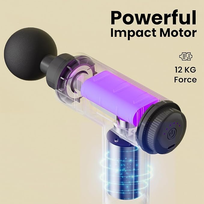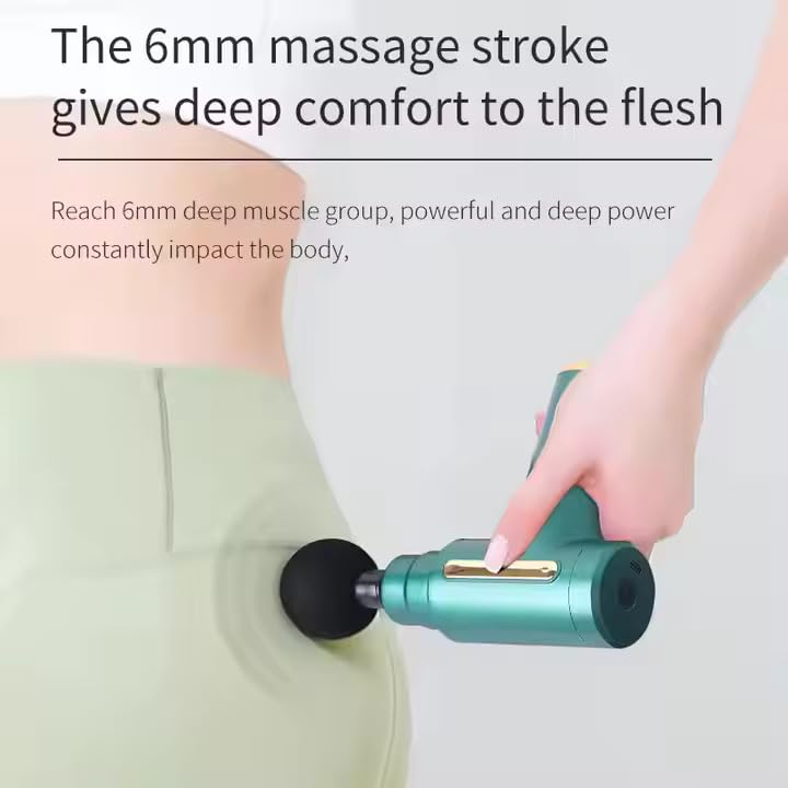 Enhance muscle recovery and relaxation with Gun Massager. Engineered to accelerate muscle recovery, our advanced deep tissue gun massager targets specific muscle groups with precision. It’s perfect for soothing soreness, reducing stiffness, and revitalizing your body after workouts or long days. **CUSTOMIZABLE MASSAGE OPTIONS** Enjoy 6 adjustable intensity modes and 4 specialized massage heads (Round, Bullet, Flat, and Fork) to suit your needs. From gentle relaxation to deep tissue therapy, this gun massager adapts to your unique pain relief requirements, targeting sore muscles, back pain, and joint stiffness with precision. **POWERFUL, QUIET, AND DURABLE** Equipped with a 24W motor and a lithium-ion battery, our advanced massager delivers up to 3200 strokes per minute for effective relief. Quiet Motion Technology ensures minimal noise during use, so you can relax in peace. The long-lasting battery provides 90-150 minutes of performance on a single charge, with a quick 3-4 hour recharge time via the included USB cable. (Usage time varies depending on the intensity level selected) **SAFE, CONVENIENT, AND VERSATILE** Safety is built into its design, with an auto-off feature to prevent overheating after 15 minutes of continuous use. The ergonomic one-button control makes operation simple, while adjustable speed settings allow precise targeting of muscle groups. Ideal for athletes, fitness enthusiasts, or anyone seeking deep muscle recovery.**A THOUGHTFUL GIFT FOR WELLNESS** Rechargeable Massager Gun is an excellent gift for fitness lovers, athletes, or anyone in need of recovery support. It’s a perfect blend of innovation and convenience, ensuring deep relaxation and muscle relief anytime, anywhere. Its ability to provide deep tissue massage and alleviate tension makes it the perfect companion for recovery and relaxation.