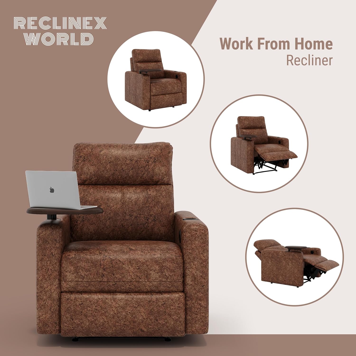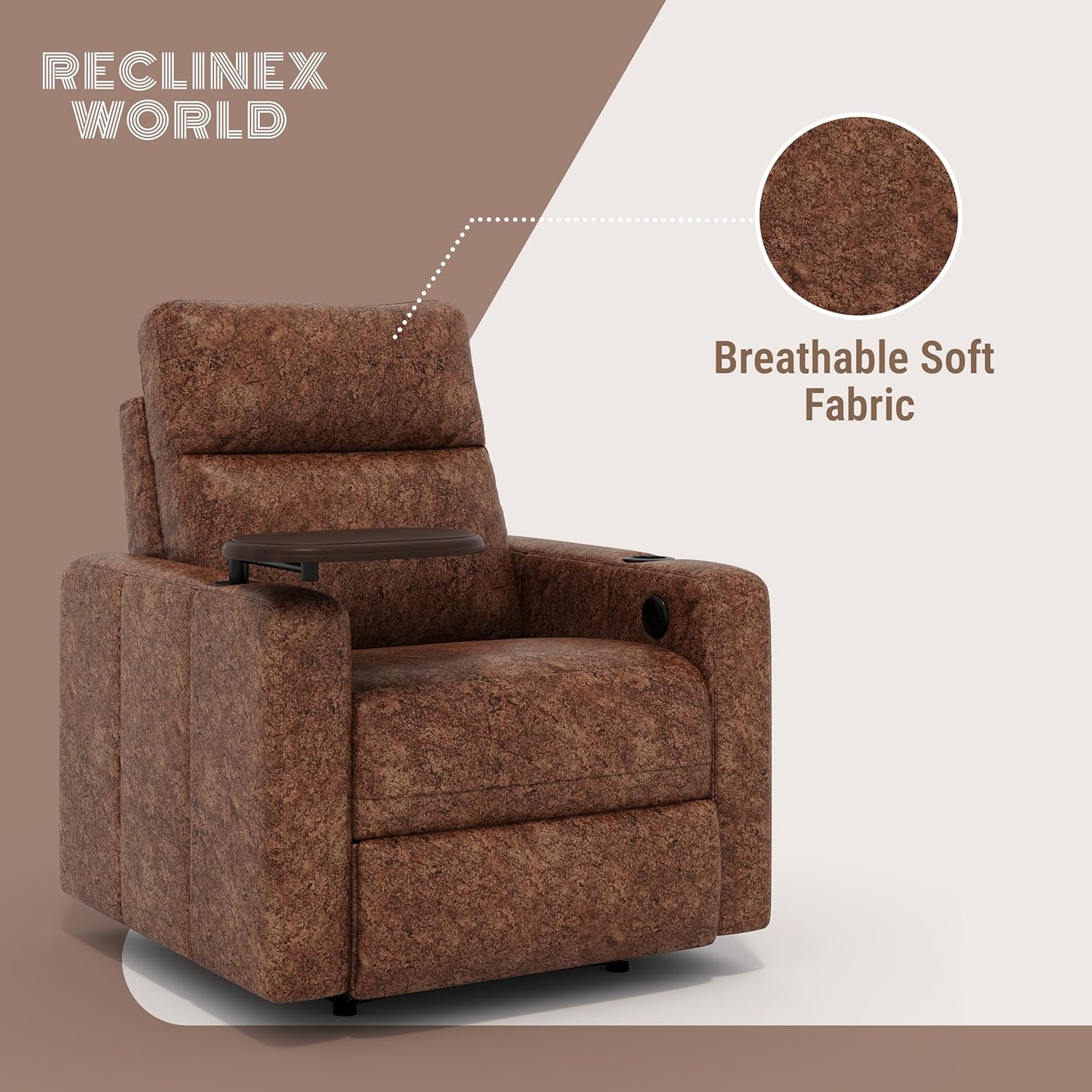 Reclinex World Motorised Work from Home Office Recliner Chair with Cup Holder and Laptop Table, Breathable Fabric, Brown