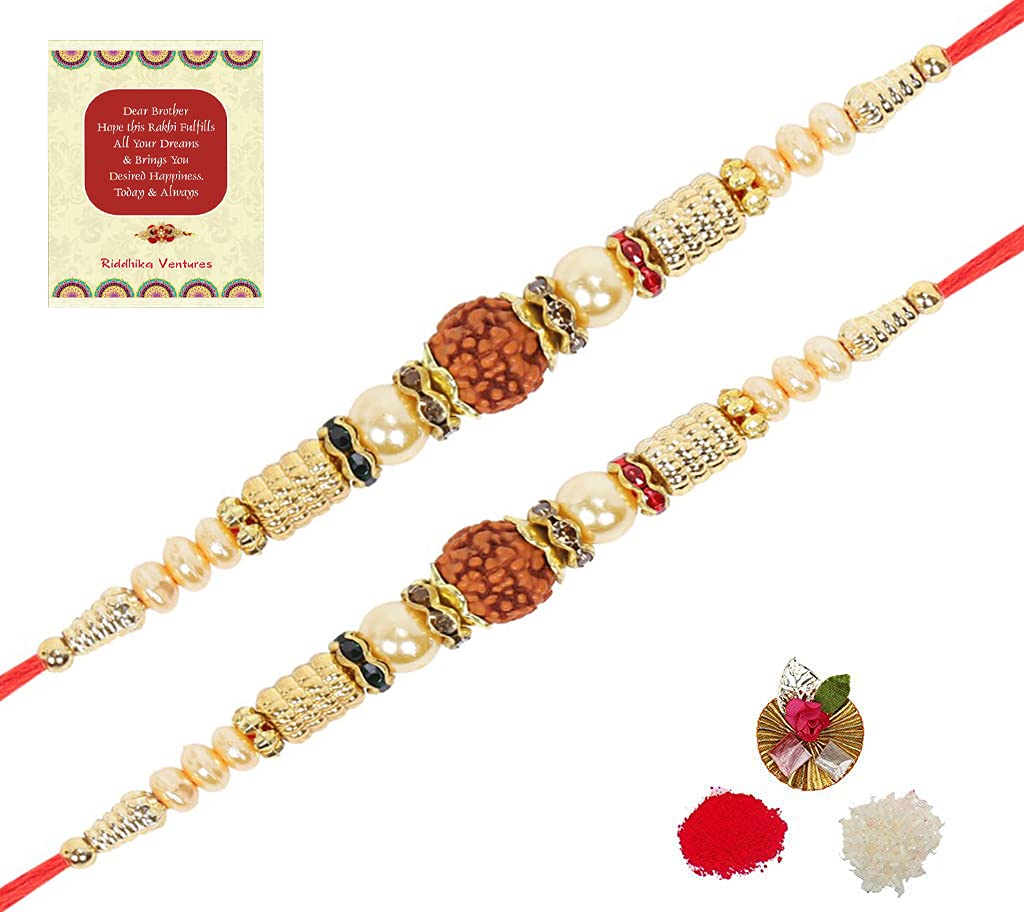 Riddhika Ventures Brown Rudraksh and Pearl Rakhi Set of 2 with Roli Chawal and Greeting Card (H1H1)
