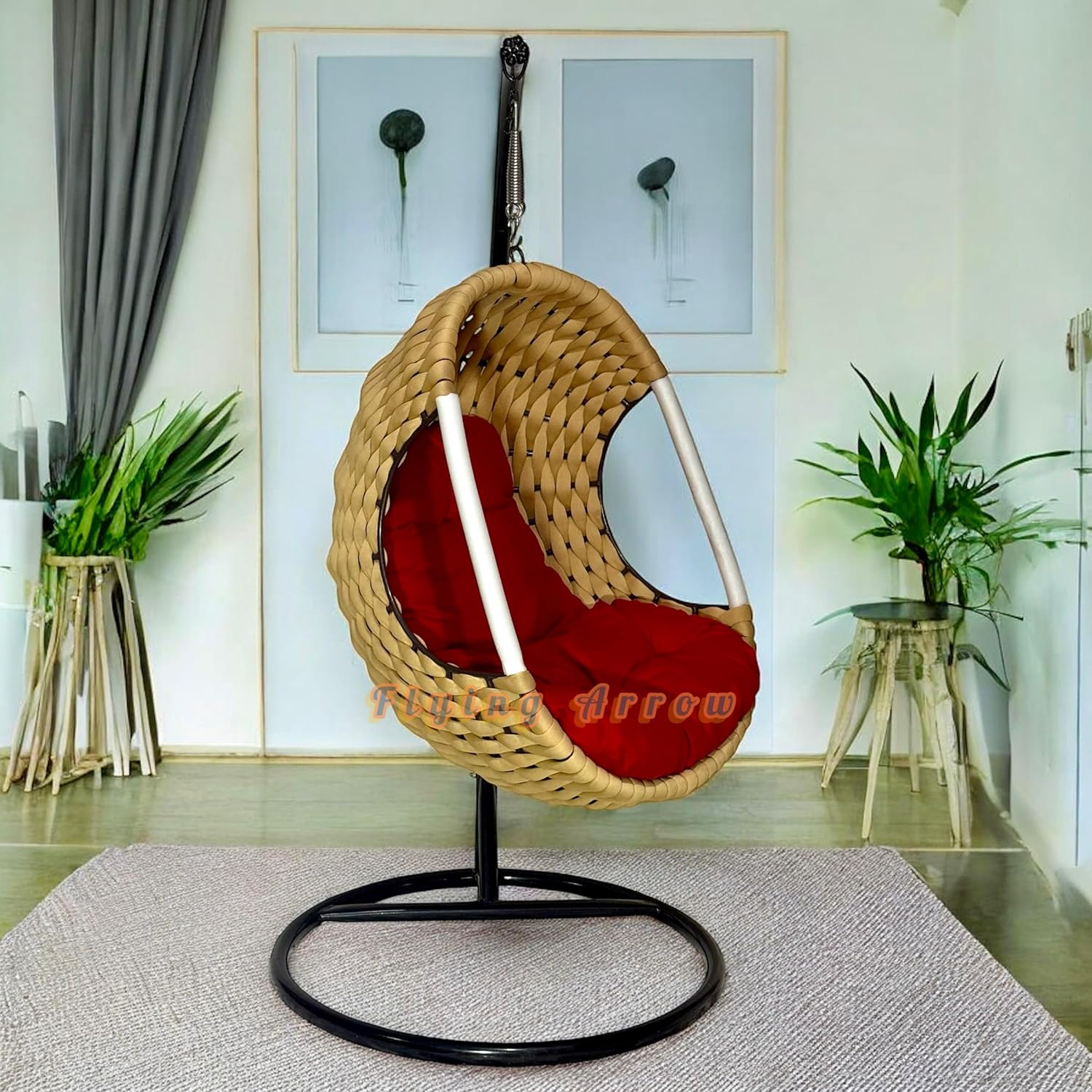 Rope Braided Iron Single Seater Swing Chair with Stand – Stylish & Comfortable Cushion & Hook Outdoor ||Indoor || Balcony || Garden || Patio || Living Outdoor Furniture (Beige/RED)