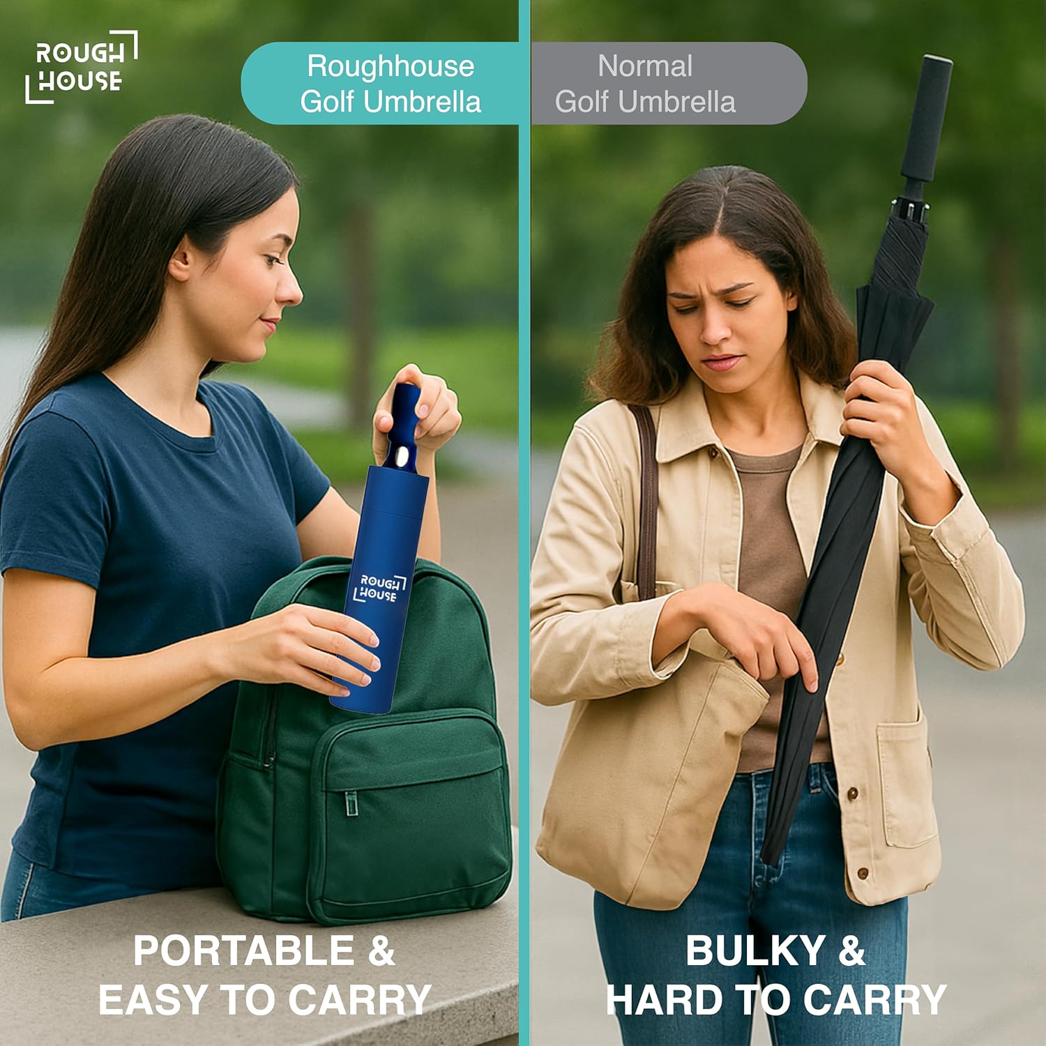 Roughhouse Foldable Jumbo XL Golf Umbrella – Windproof, Tri-Fold Large Umbrella for Men & Women | Stylish & Portable | All-Weather Protection for Rain, Sun, Travel, & Outdoor Use