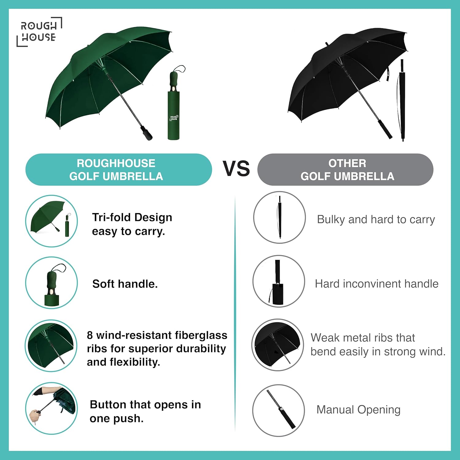 🧳 TRI-FOLD FOLDABLE DESIGN – Unlike traditional golf umbrellas, Roughhouse folds down small and neat. Easy to stash in your backpack, duffel, or car—your rain armor goes wherever you do.