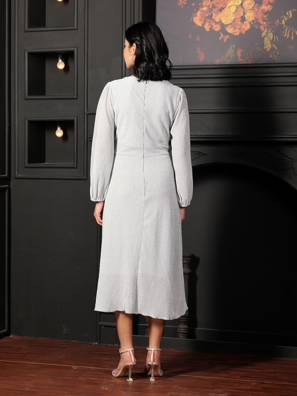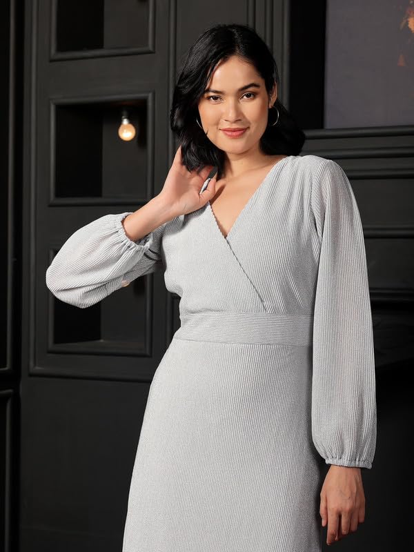 Salt Attire Women’s Darla Shimmer A-Line Dress – V-Neck, Faux Wrap, Over-The-Knee Length, Full-Length Blouson Sleeves, High-Low Hem, Metallic Plisse Fabric, Made in India.