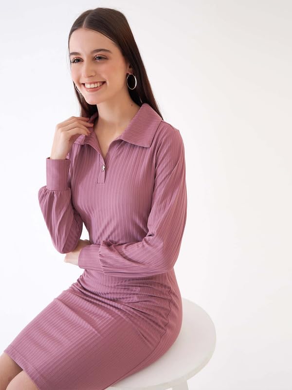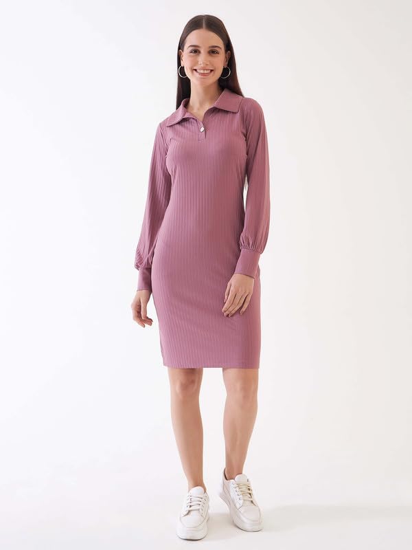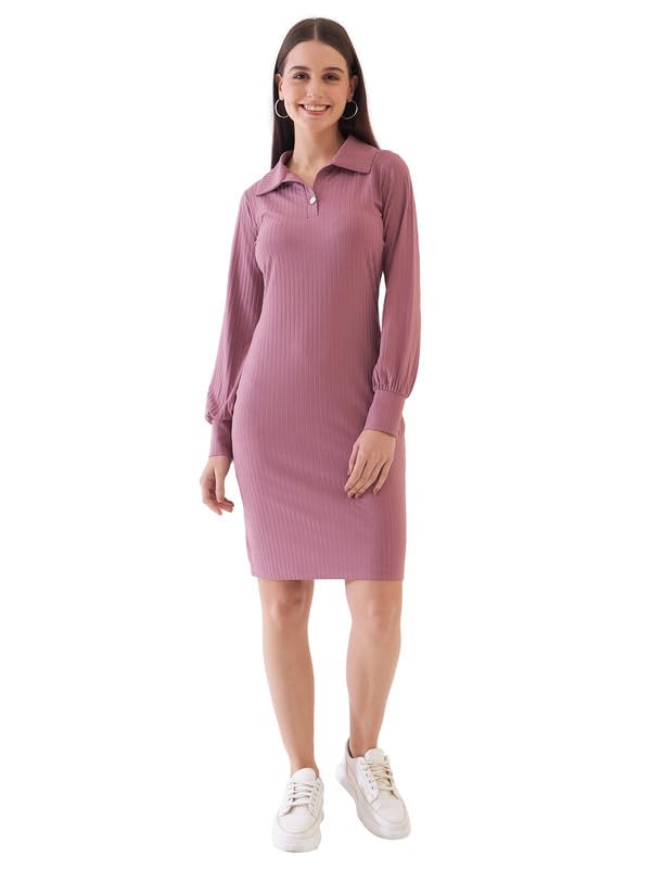 Salt Attire Women’s Dusty Pink Ribbed-Knit Full Sleeve Dress – Solid Color, Collared Neck, Cotton Blend Fabric, Comfortable and Stylish, Made in India, Perfect for Casual and Semi-Formal Occasions.