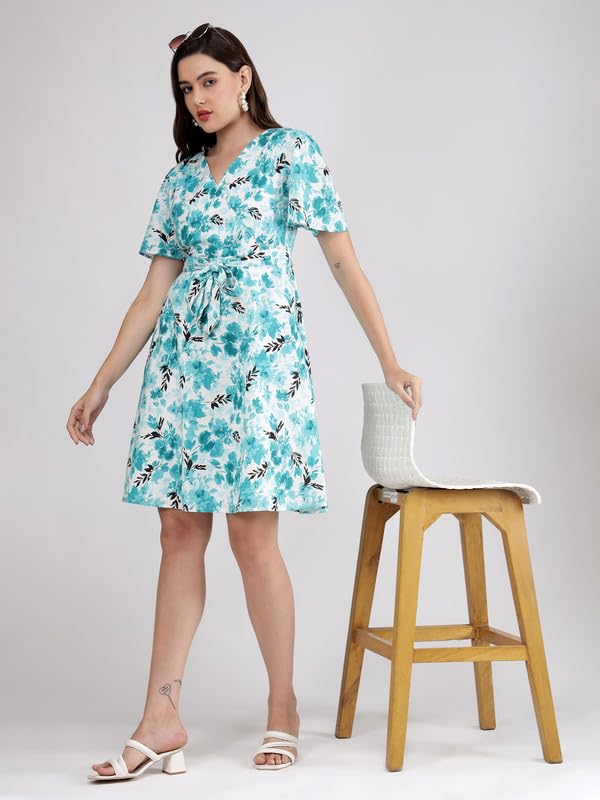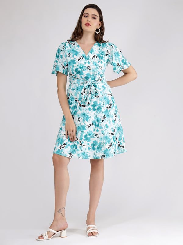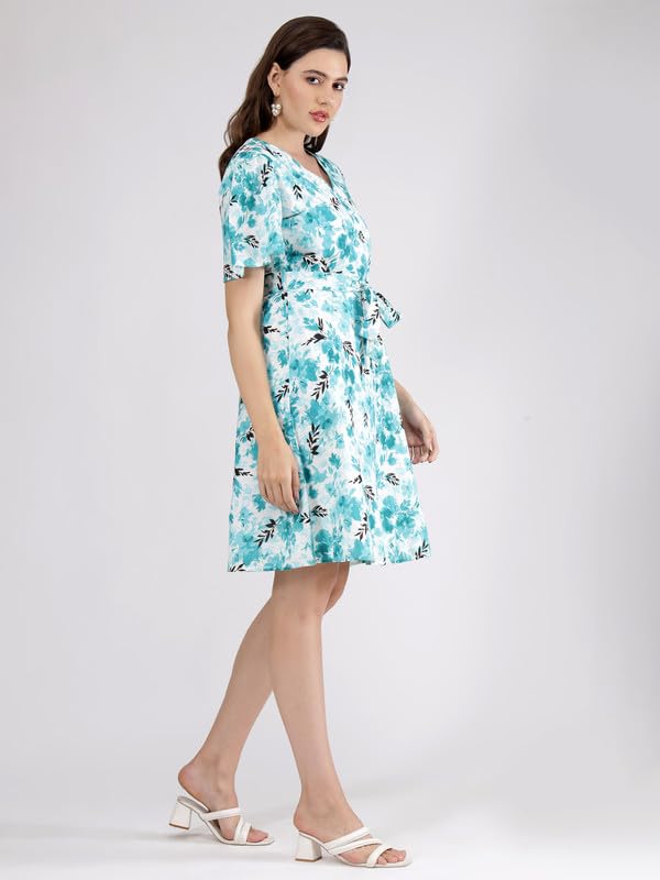 Salt Attire Women’s Floral Fit & Flare Dress, Linen, Midi Length, V-Neck, Half Sleeve, Workwear, Floral Print, Made in India Multicolour