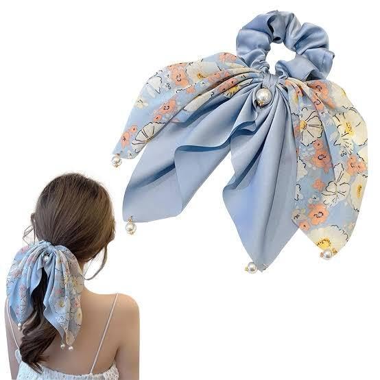 Scarf Scrunchies Satin Floral Tail Scrunchies Hairties for Women Girls Pearl Hair accessories hairbands blue