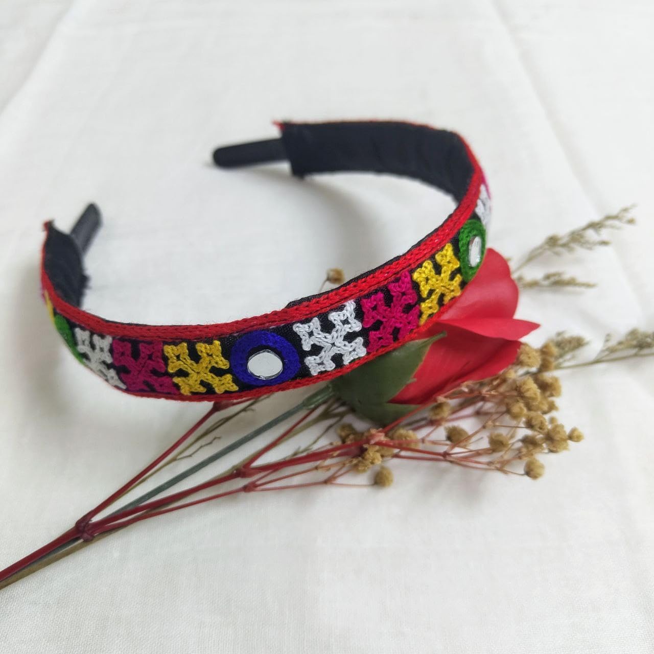 HANDCRAFTED DESIGN: Beautiful handcrafted crochet hairband featuring traditional Indian mirror work and multicoloured embroidery perfect for festive occasions