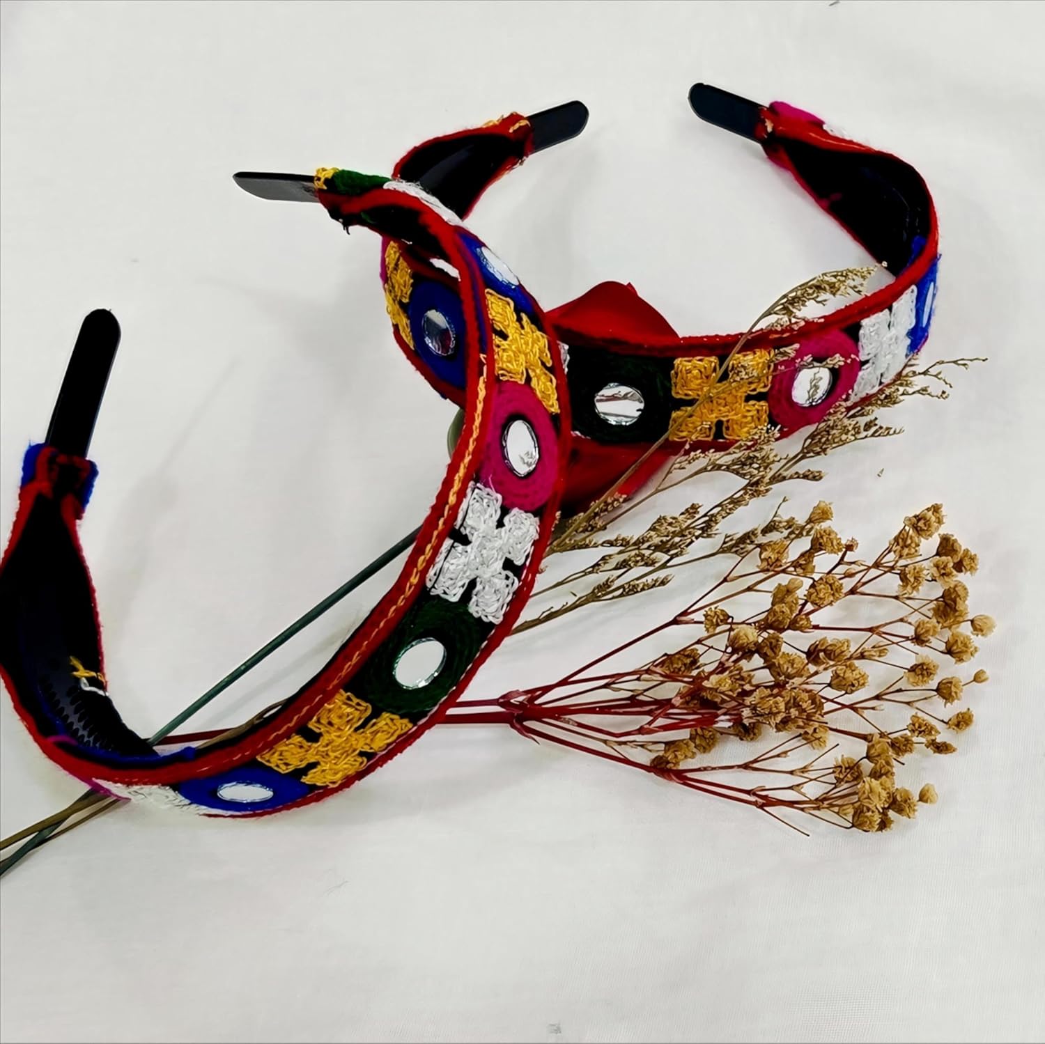 Add a vibrant touch to your festive look with this exquisite handcrafted crochet hairband. Perfect for Navratri celebrations and Dandiya nights, this multicoloured hair accessory features intricate traditional embroidery work with mirror embellishments. The striking combination of red, green, blue, yellow, and pink threads creates beautiful patterns that complement any traditional attire. The comfortable headband design sits securely and elegantly, making it ideal for dancing and celebrations. This versatile piece can be styled as a traditional matha patti or modern tiara, suitable for various occasions. The durable crochet work and quality craftsmanship ensure long-lasting wear. Whether you’re participating in cultural festivities or looking to add a traditional touch to your outfit, this hair accessory is a perfect choice for both girls and women.