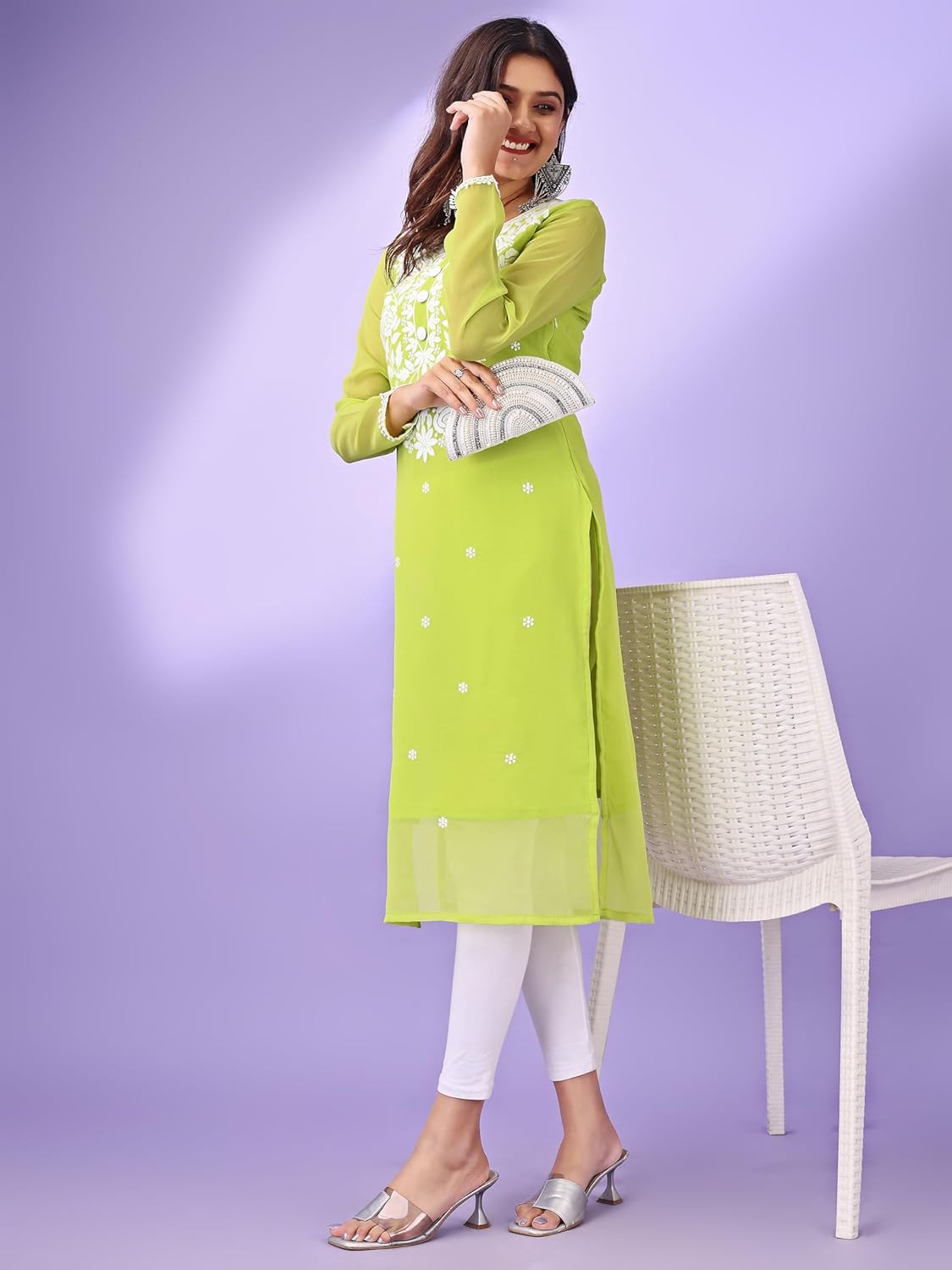 Introducing the SIZU Women’s Georgette Kurti with Chikankari Lakhnavi Embroidery Work – a masterpiece of elegance and artistry that brings together timeless design and modern comfort. Crafted with the utmost care, this exquisite Kurti showcases the intricate beauty of Chikankari Lakhnavi Embroidery, a traditional technique that has graced the attire of royalty for generations. Each delicate stitch tells a story of skilled craftsmanship and cultural heritage, making this Kurti a true embodiment of grace and tradition. Made from premium quality Georgette fabric, the SIZU Kurti ensures a lightweight and breathable experience, keeping you comfortable throughout the day. The flowing silhouette drapes effortlessly, flattering all body types and exuding a sense of understated glamour. The intricate Chikankari Lakhnavi Embroidery, adorning the Kurti’s neckline, sleeves, and hem, adds a touch of opulence to your ensemble. The meticulously hand-embroidered patterns showcase a symphony of floral motifs and delicate details, creating an aura of refined elegance that is perfect for both formal occasions and casual gatherings. Whether paired with your favorite jeans, leggings, or traditional bottoms, the SIZU Women’s Georgette Kurti effortlessly elevates your style quotient. It’s not just a piece of clothing; it’s a work of art that reflects your appreciation for craftsmanship and your sense of fashion. Elevate your wardrobe with the timeless allure of the SIZU Women’s Georgette Kurti with Chikankari Lakhnavi Embroidery Work. Experience the blend of tradition and contemporary design in every stitch, and make a statement that resonates with sophistication and grace.