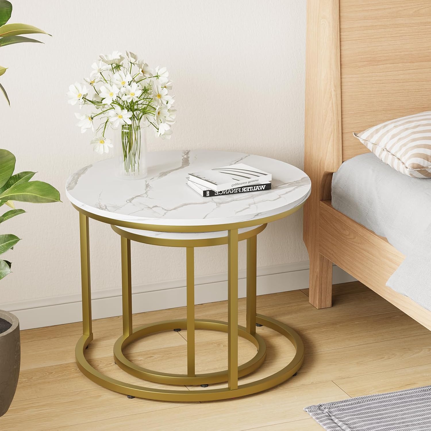 Smuxee White Nesting Coffee Table Set of 2, 23.6“ Round Coffee Table Wooden Marble Pattern with Adjustable Non-Slip Feet, Industrial End Table for Living Room Bedroom Balcony Gold