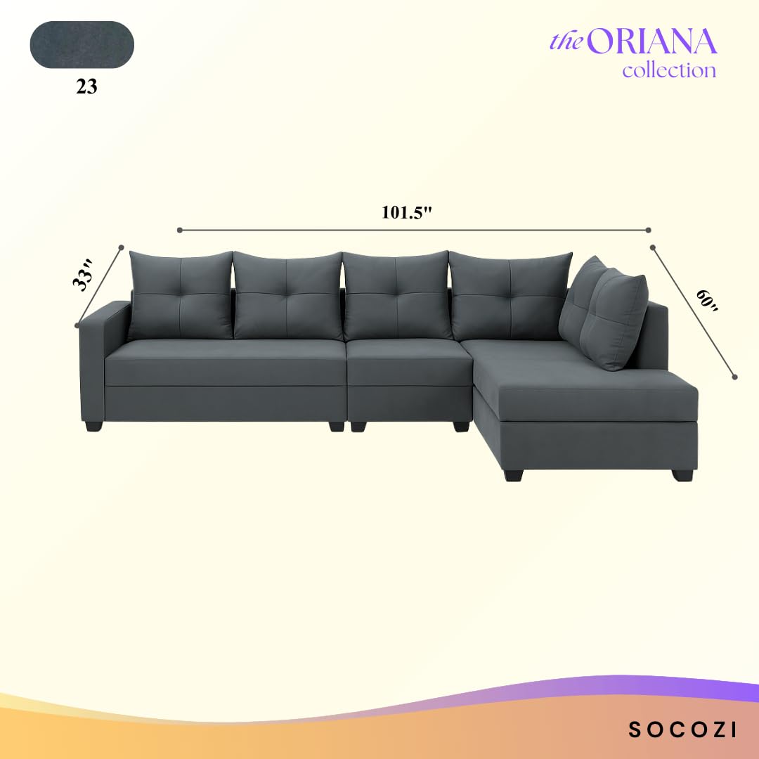 SOCOZI Oriana 6 Seater RHS L Shape Sofa Set | Soft Velvet Suede Fabric | Modern Design | Plush Comfort Cushions for Living Room (Dark Grey)