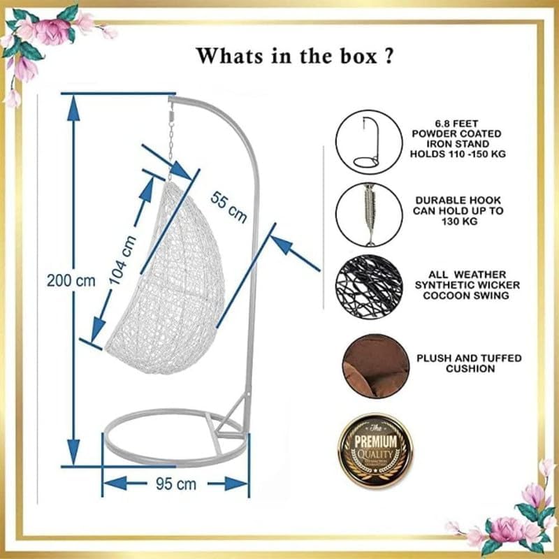 ✔💐💝💞💚 Premium Fluffy Cushion – It comes with a Soft deep fluffy cushion, perfect for you to snuggle in on a warm and sunny day, with a book and a cold coffee. Sturdy & Durable: Constructed with a powder-coated metal frame, ensuring long-lasting durability and resistance to weather elements. Complete Set: Includes a freestanding stand and plush cushions, offering everything you need for immediate relaxation