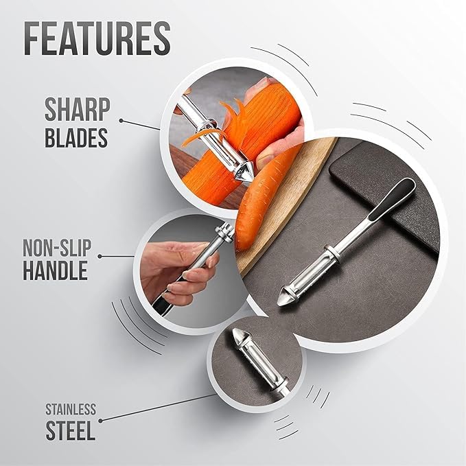 PEEL WITH EASE: Save time and make your meal prep a breeze with our easy-to-use fruit peeler! Great for both right and left-handed users, the razor-sharp blades effortlessly slice through peels while precision ground swivel tackles produce of any shape or size.