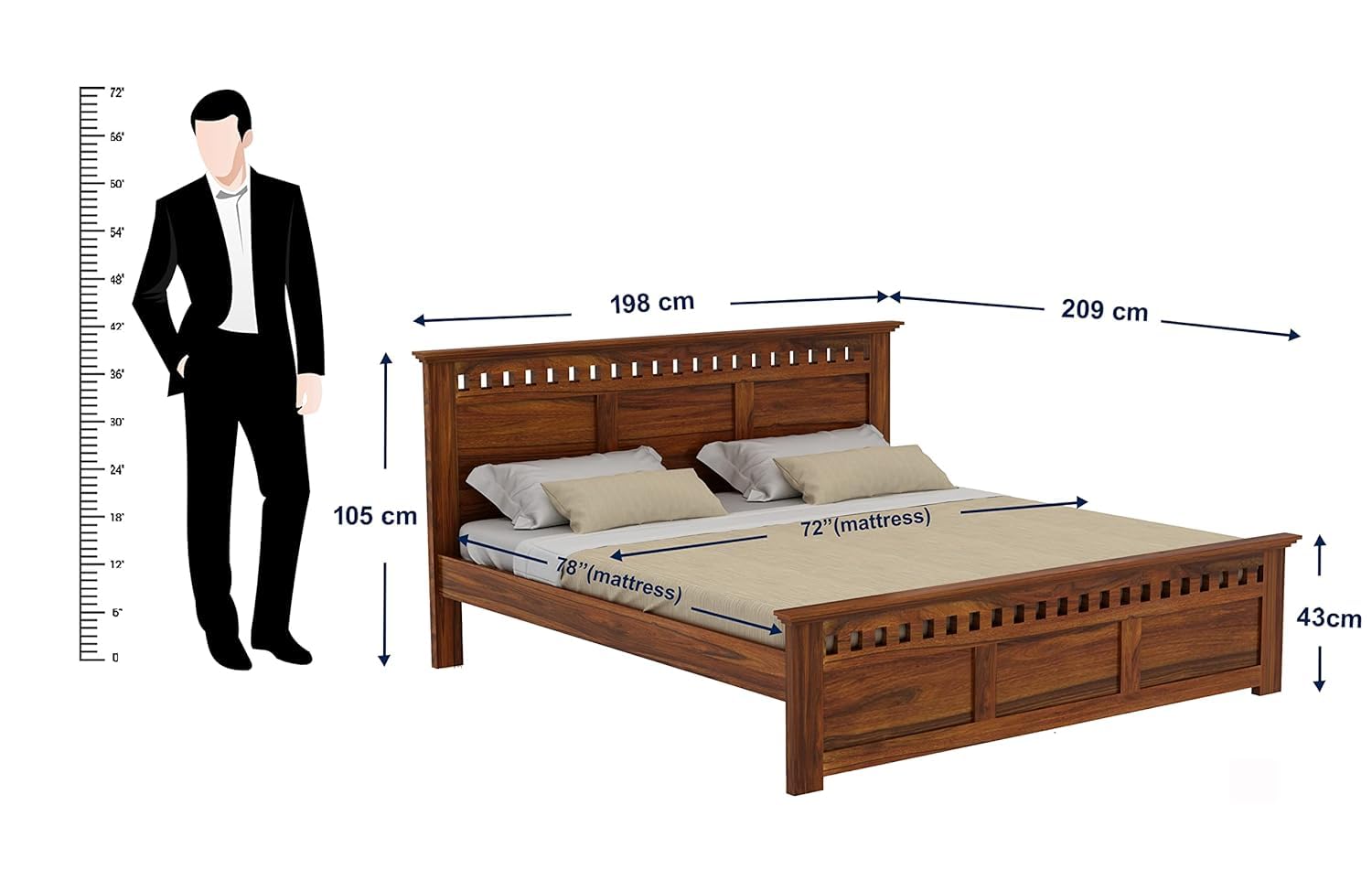 ✔ Dimensions:- Mattress Size (LxW in Inch):- 78×72 inches, Product Dimensions:- (LxW in Inch) 81×75. Product comes with standard bed height.