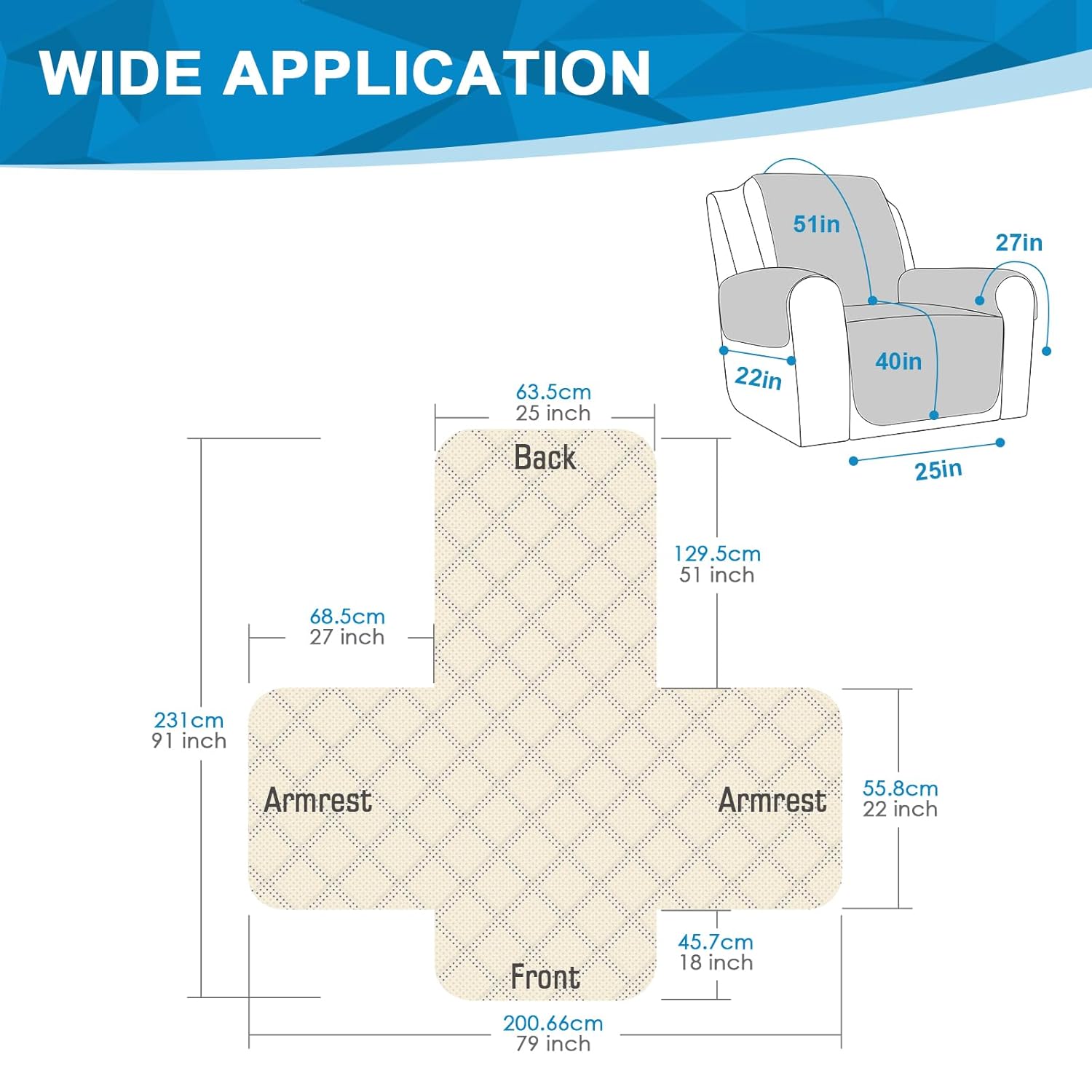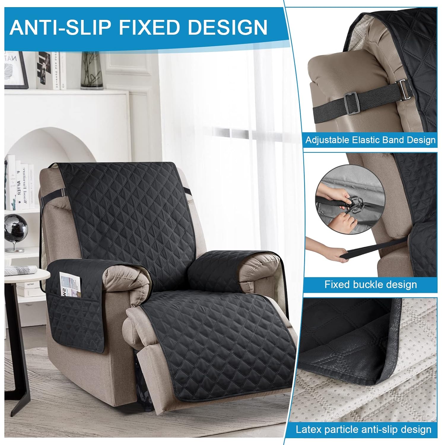 【Pockets Storage & Anti-slip】This couch cover recliner with 6 pockets (3 on each side) and no need to worry about storing items such as remote control, magazines etc.. The soft&comfortable fabric allows you to play with pets without any worries, and also prevents pet fur from sticking directly to the couch recliner. We have also added anti slip particle design on the back that you can clearly distinguish between the front and back.