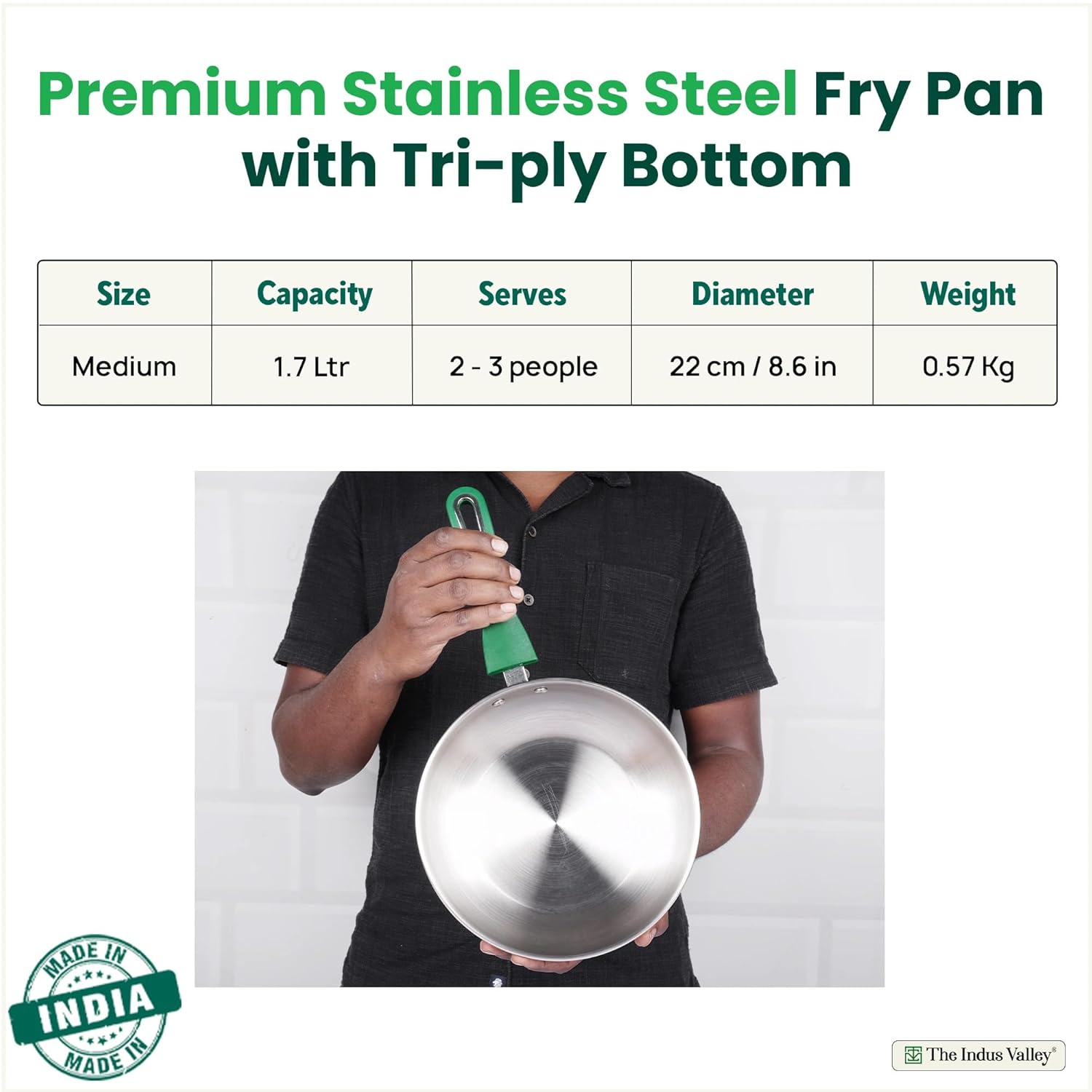 💪100% FOOD SAFE: The Indus Valley’s Premium Stainless Steel Fry Pan with Tri-ply Sandwich Bottom is 100% food-safe; without chemical coating.