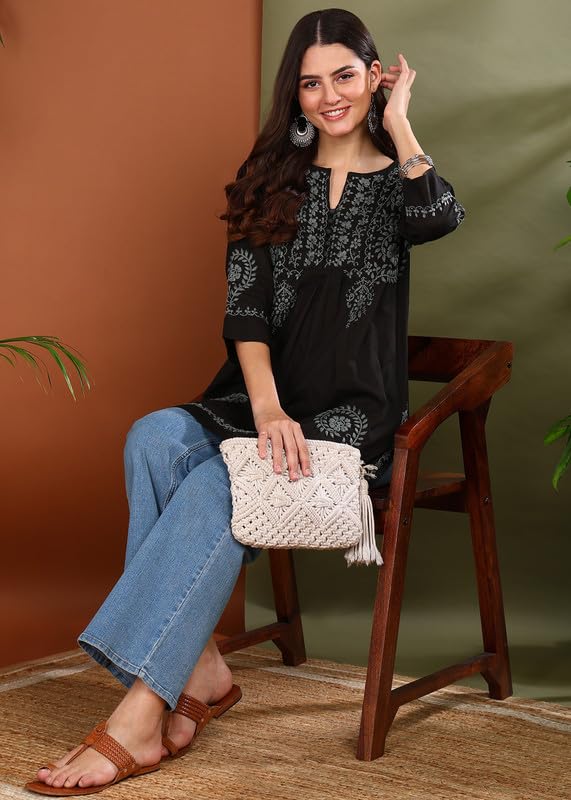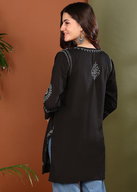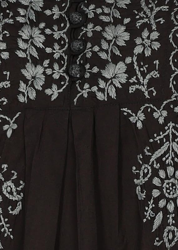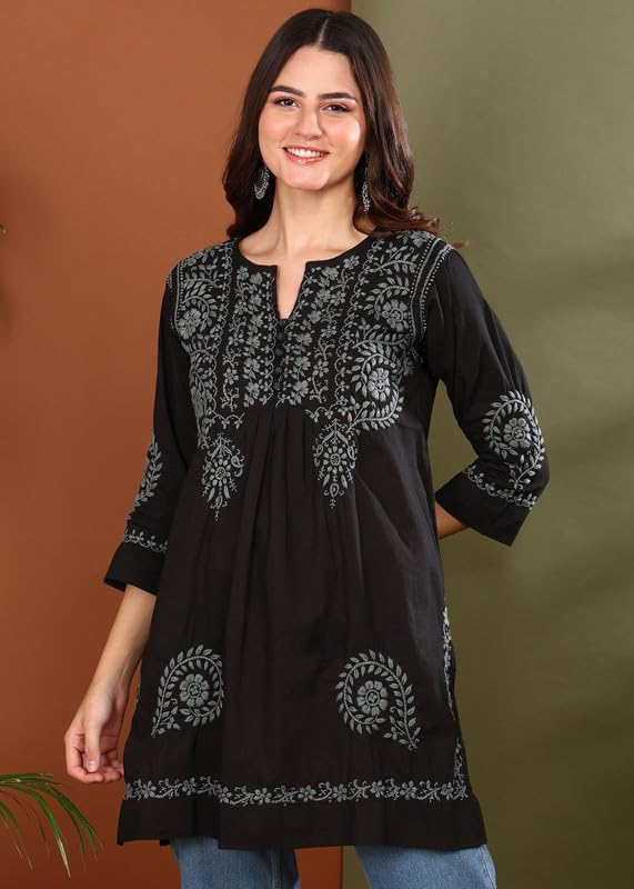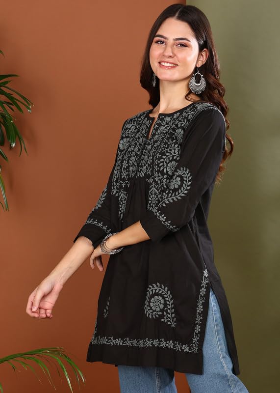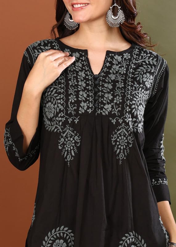 Vahson Hand Embroidered Lucknow Chikankari A-line Black Cotton Kurti for Women