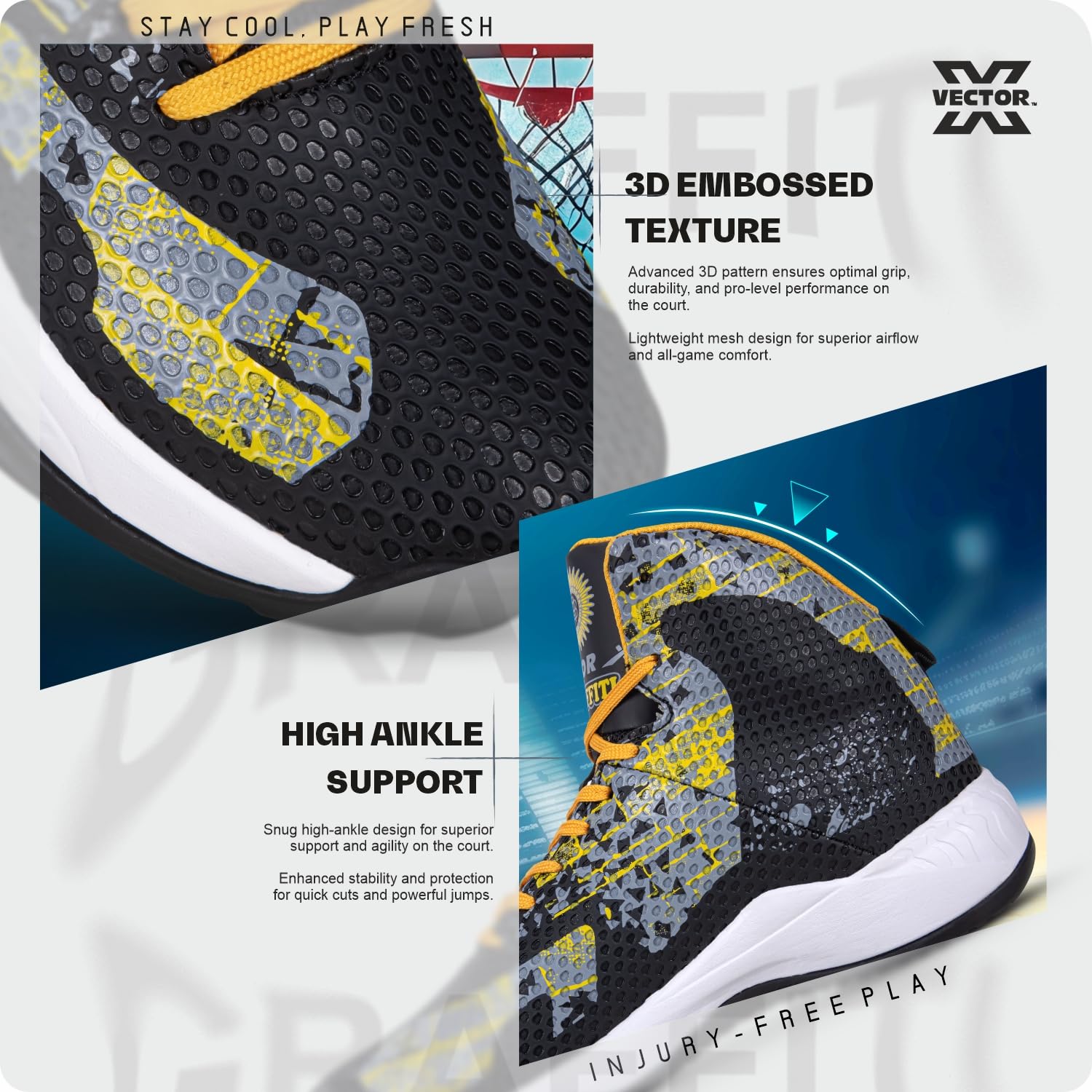 3D Embossed Texture: Advanced 3D pattern enhances grip and durability for top-tier performance. Breathable mesh upper ensures airflow, keeping your feet cool, dry, and comfortable throughout every high-energy game.