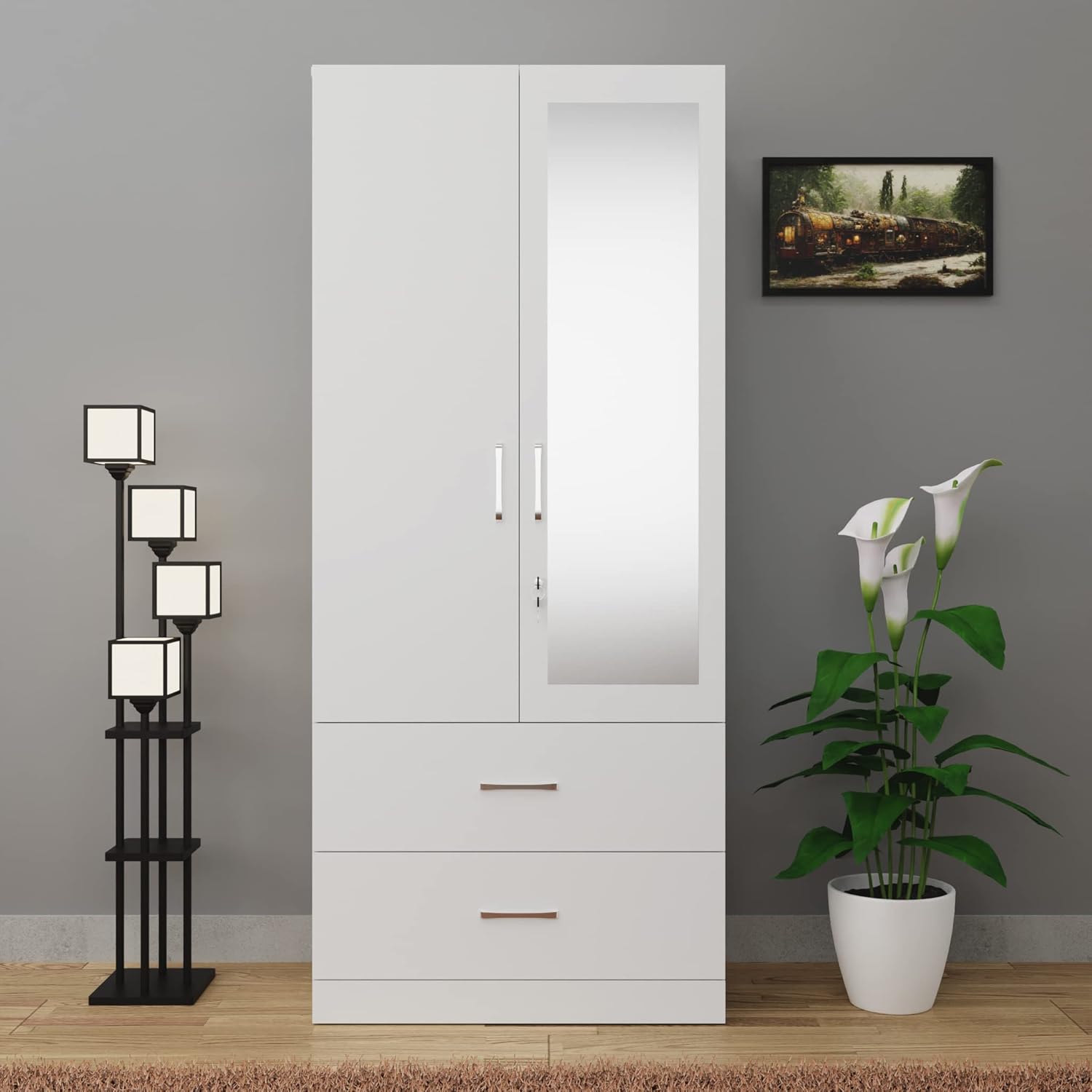 VIKI Wardrobe | Wooden Almirah for Clothes,Door for Bedroom, 2 Door Wardrobe with Drawer, Mirror & Hanging Space (Frosty White – 40D x 80W x 180H) | 1 Year Warranty | Free Assembly