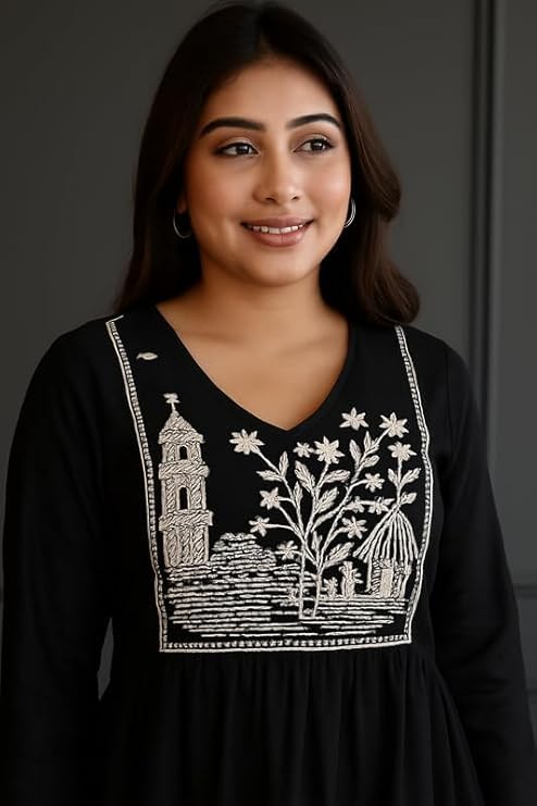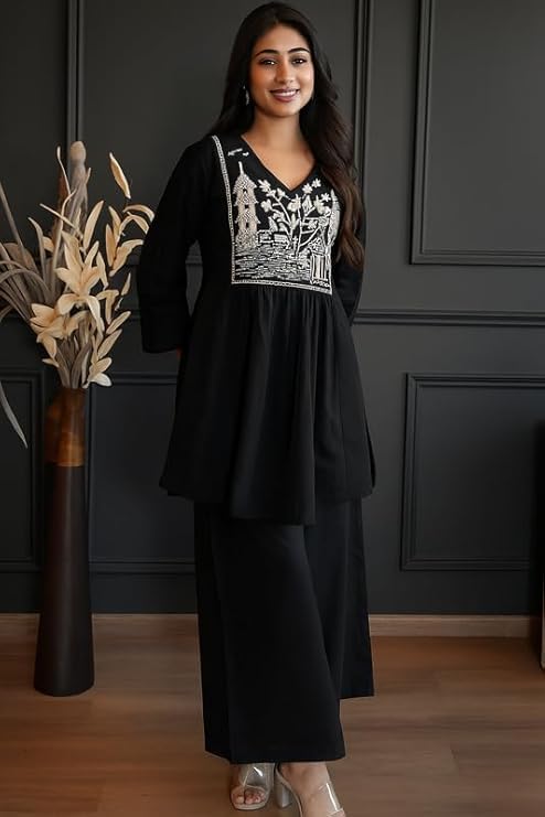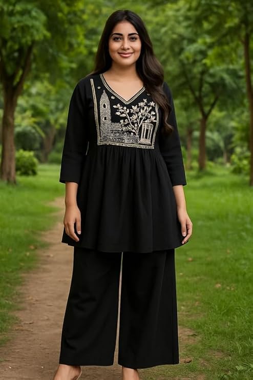 Introducing the latest addition to your ethnic wardrobe – the Anushil Women’s Cotton Embroidered Kurta with Palazzo Set, a perfect blend of comfort, elegance, and contemporary Indian style. This V-neck kurta, crafted in soft and breathable premium cotton fabric, features beautiful handcrafted embroidery on the front yoke that elevates your overall look. Designed for both work and festive wear, this kurta set brings the versatility every modern woman needs. Whether you’re attending an office meeting, stepping out for brunch, or celebrating festive occasions, this kurta set adds an effortless charm to your personality. The flattering A-line cut complements all body types and is available in inclusive plus sizes for curvier silhouettes. The cotton palazzo pants offer maximum movement with a semi-elasticated waist for added comfort throughout the day. Available in three vibrant and trendy colors – Classic Black, Royal Teal, and Vibrant Magenta – each color is designed to reflect your individual style while staying rooted in timeless Indian fashion. Pair it with oxidized jewelry and block heels for a complete ethnic chic ensemble. Machine washable, fade-resistant, and ideal for daily wear, this outfit is a must-have in your wardrobe. Anushil, your trusted Indian ethnic brand, ensures quality, comfort, and contemporary fashion for today’s woman. Shop now and elevate your ethnic wear game with this exclusive designer kurta set made for India and beyond. Perfect for Indian weddings, office parties, Diwali, Navratri, Rakhi, or even Indo-Western fusion styling. Stay stylish. Stay graceful. Choose Anushil.