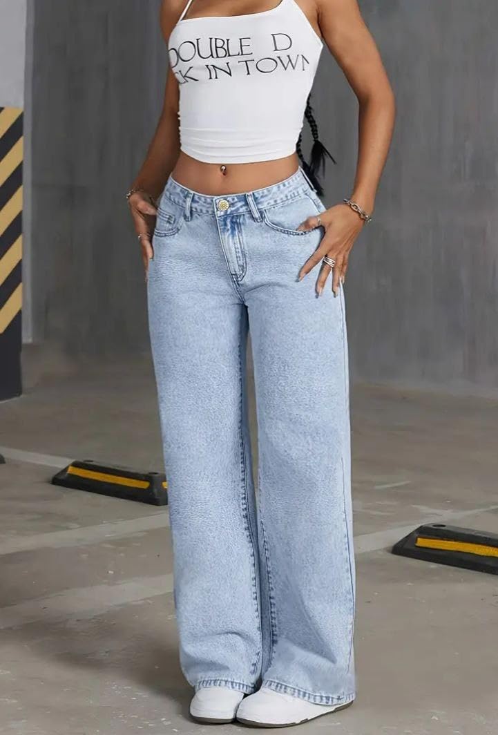 Make a bold fashion statement with these trendy wide-leg jeans in a classic light wash. These relaxed-fit denim trousers feature a high-rise waist that perfectly complements crop tops and fitted blouses. The generous leg width creates a flowing silhouette that elongates your frame, while the quality denim material ensures durability and comfort throughout the day. The vintage-inspired light blue wash adds versatility to your wardrobe, making these jeans suitable for both casual outings and styled-up occasions. The traditional five-pocket design and button closure maintain classic denim functionality, while the contemporary cut brings modern flair. These jeans pair beautifully with everything from casual trainers to elegant heels, making them a versatile addition to any fashion-forward wardrobe.