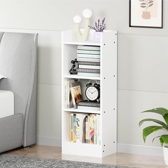 STORAGE CAPACITY: Features 4 open shelves providing ample space for books, decorative items, storage baskets, and office supplies