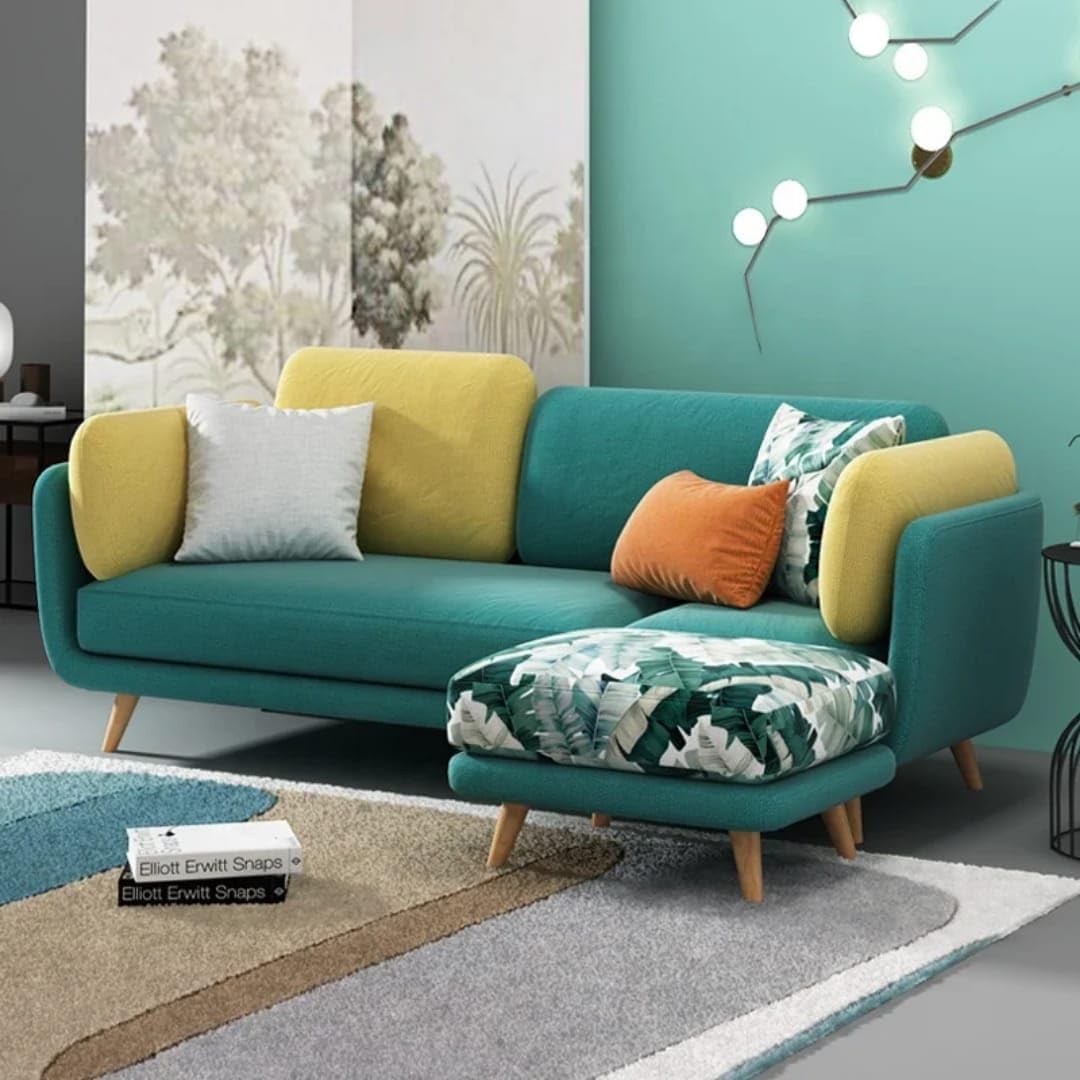Wood Vogue 3 Seater Chesterfield Sofa with Chaise Lounge, Couches for Living Room, L-Shaped Couch with Ottoman, Sectional Couch for Small Living Room (Teal Green and Yellow)