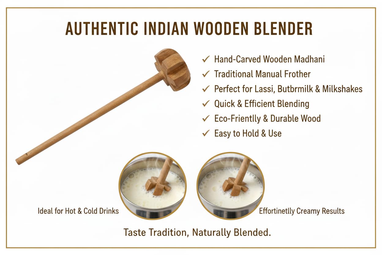 Traditional Wooden Churner for Buttermilk & Lassi – Crafted from sustainable wood, this manually operated butter churner (madani) is ideal for preparing creamy butter, frothy lassi, and smooth buttermilk the authentic way.