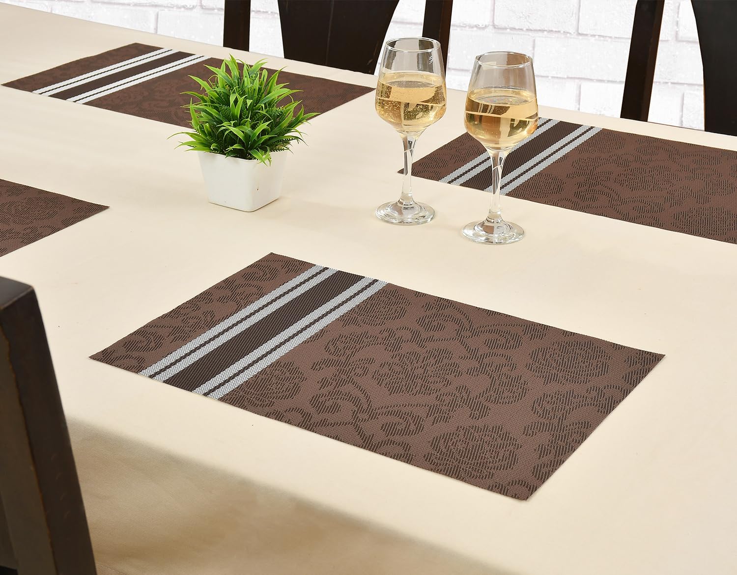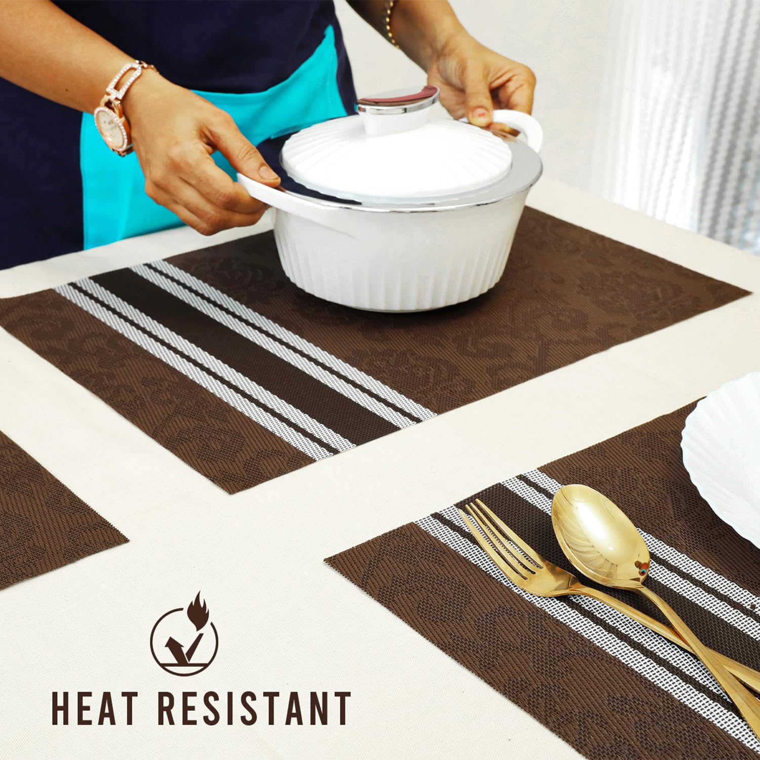 Yellow Weaves PVC Dining Table Placemats | Heat Resistant Dining Table Place Mats for Kitchen Coffee Center Table Side Party – (Set of 4, Dark Brown Stripe)